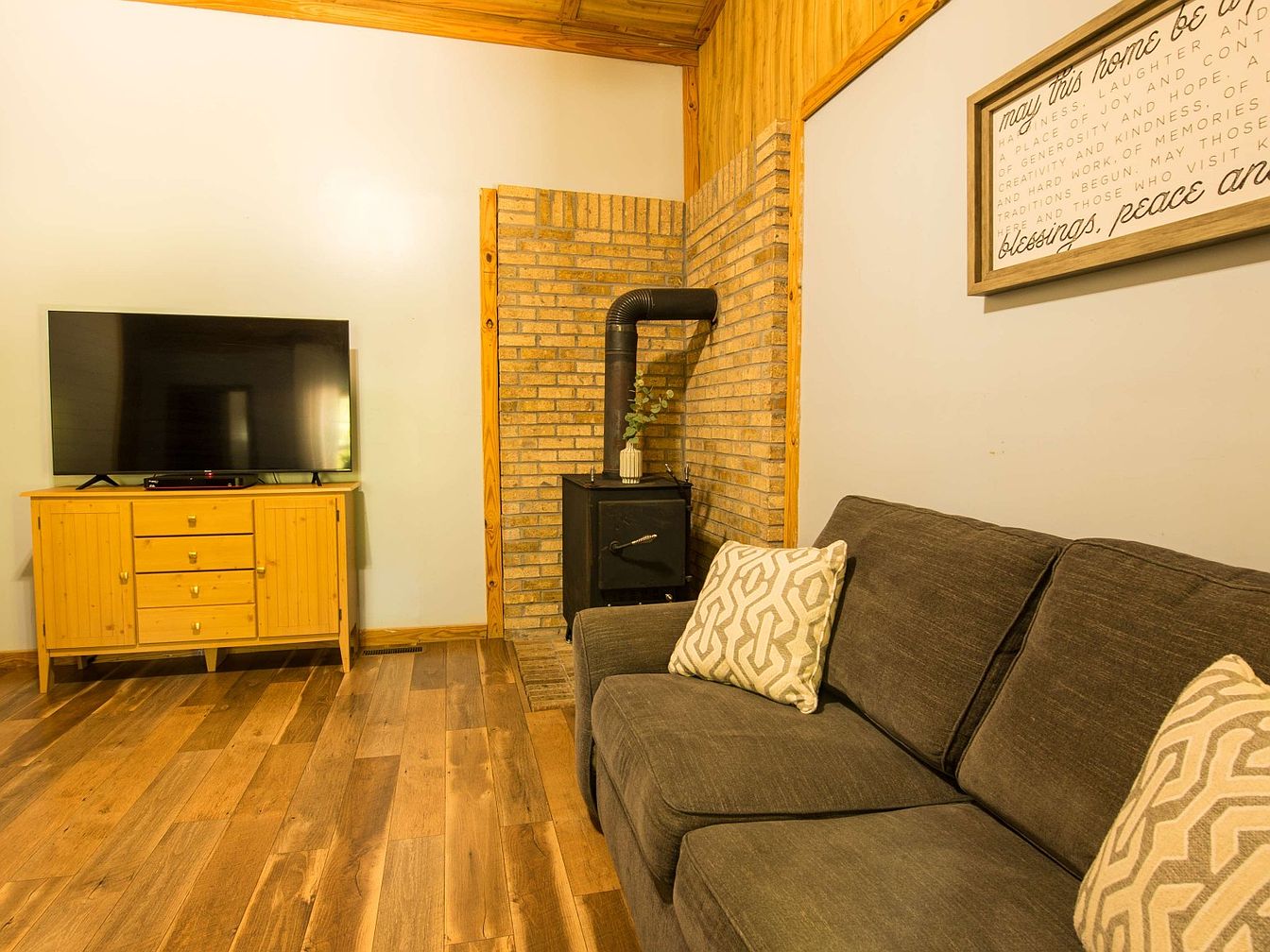 Warm and inviting living room corner featuring a stylish dark grey sofa with patterned throw pillows, creating a cozy seating area perfect for families. The rich, wide-plank wood floors complement the light yellow wooden media console, which supports a flat-screen TV for entertainment. An efficient black wood-burning stove sits in a brick alcove, adding rustic charm and providing a safe, family-friendly heating option. The walls are painted a soft neutral shade and accented with wood trim, while a framed inspirational quote contributes to the welcoming atmosphere. This peaceful setting is both functional and aesthetically pleasing for family gatherings.