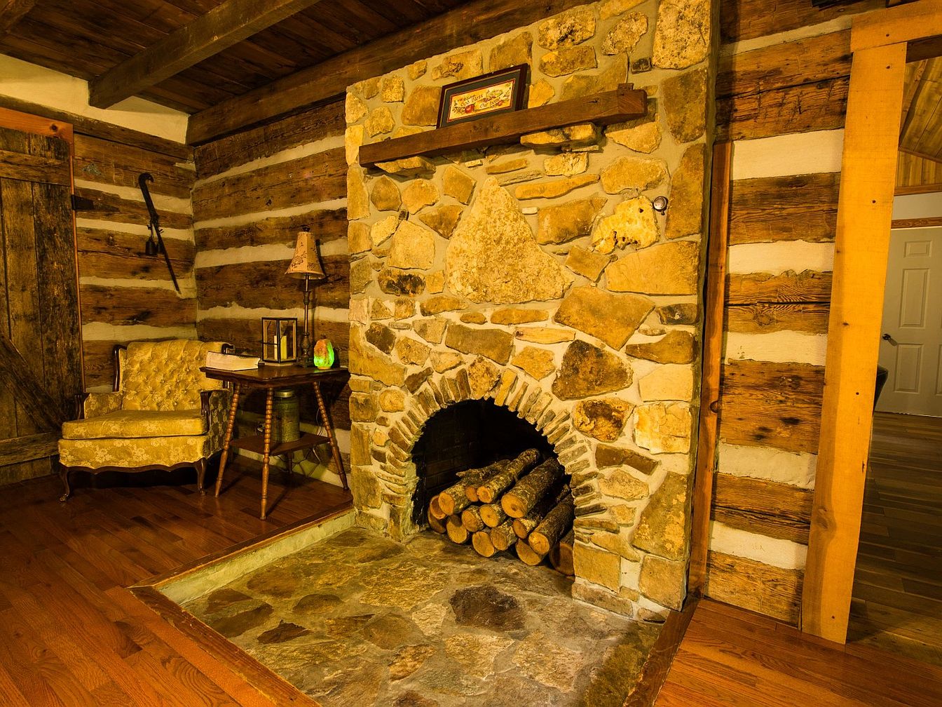 A rustic stone fireplace serves as the focal point of this warm family sitting area, perfect for gathering on chilly evenings. The room’s log cabin walls, constructed from rough-hewn wooden beams with white chinking, enhance a charming, natural ambiance. Next to the fireplace is a classic, tufted armchair in soft gold fabric, paired with a wooden side table holding a vintage lamp, books, and a decorative light. The hardwood floors and exposed wood ceiling beams further the inviting, earthy feel, creating a space that welcomes relaxation and togetherness for families to read, chat, or enjoy quiet time together.