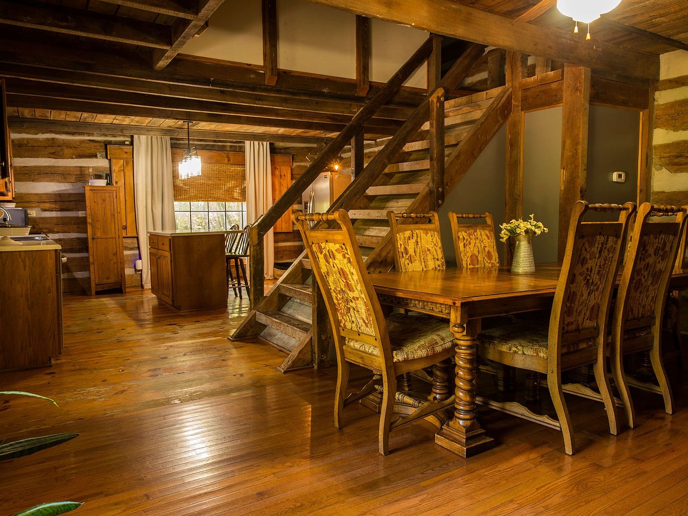 Spacious dining area connects seamlessly to a rustic kitchen beneath exposed wooden beams and natural log walls, creating a warm, inviting gathering space perfect for families. The large, rectangular dining table in polished wood is surrounded by six intricately upholstered chairs, providing ample space for shared meals. To the rear, a generously sized window fills the space with natural light, while soft beige curtains and woven blinds add a cozy touch. The staircase with chunky timber railings adds architectural character, and the open layout encourages easy movement for children and adults alike. Earthy tones and sturdy furniture make this space welcoming and practical for families.
