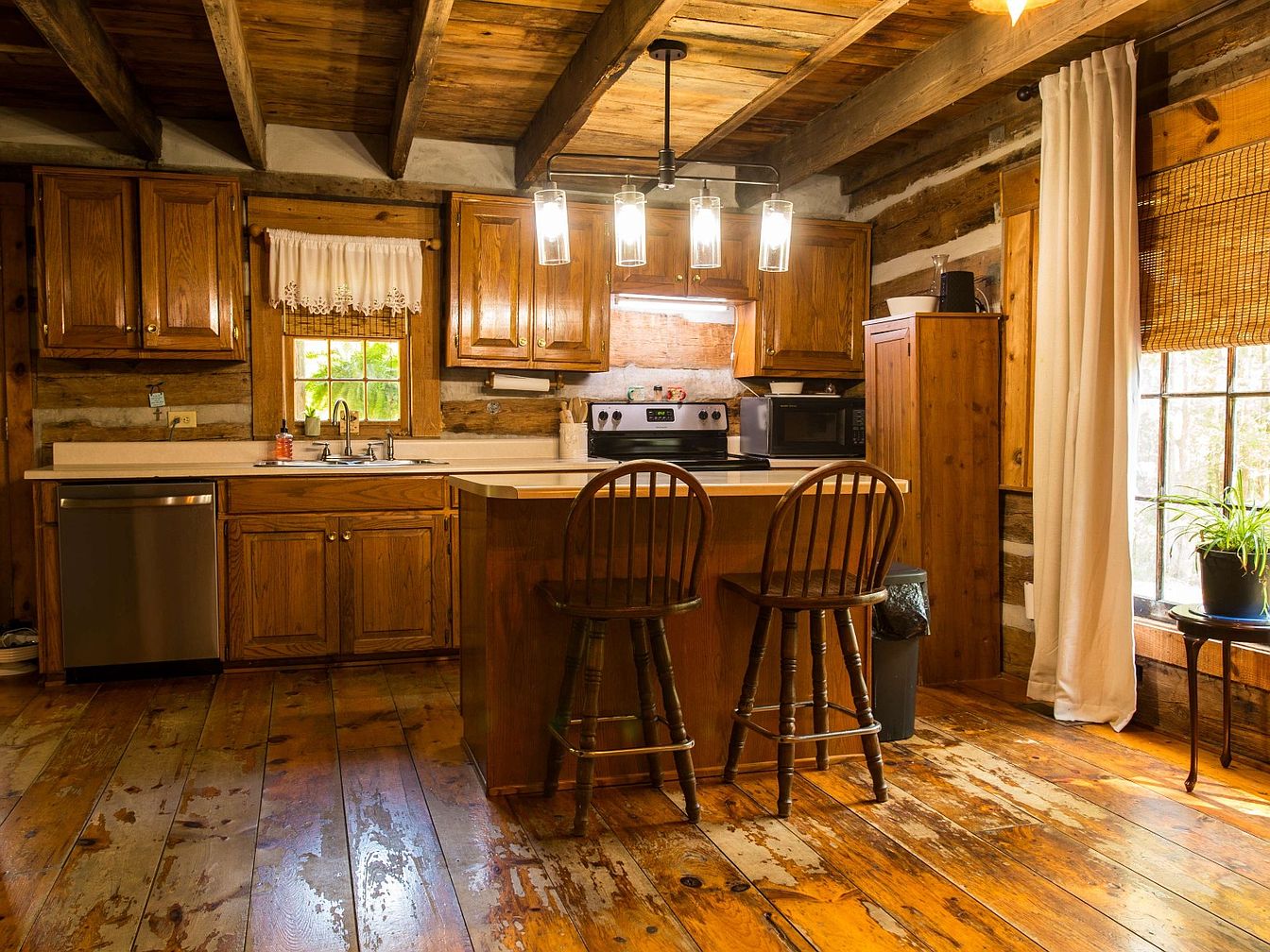 A spacious kitchen with warm, natural wood finishes suitable for family gatherings. The room features sturdy wood cabinetry and matching island, accented by two high-back wooden stools for casual dining or homework. Large rustic wooden beams frame the ceiling, complementing the wide-plank hardwood floors, giving the space a cozy, inviting feel. Ample counter space surrounds a double sink, with modern appliances like a stainless steel dishwasher and microwave for convenience. Natural light streams in through large windows, adorned with simple curtains and bamboo blinds, and a potted plant brings a touch of greenery, enhancing the homely charm and functional layout.