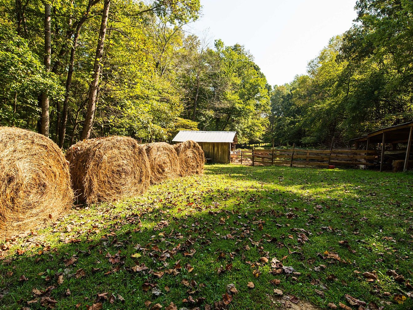A spacious backyard pastoral area stretches out under mature trees, with large round hay bales lined along the left side, offering a rustic charm. The ground is covered in green grass, dappled with fallen leaves, giving a natural, inviting look suitable for family play or outdoor activities. In the background, a small wooden barn with a metal roof sits near wooden fencing and an open shelter, providing practical space for pets or small livestock. Surrounded by lush greenery, the fenced-in area adds safety, making it perfect for children or family gatherings in a peaceful rural setting.