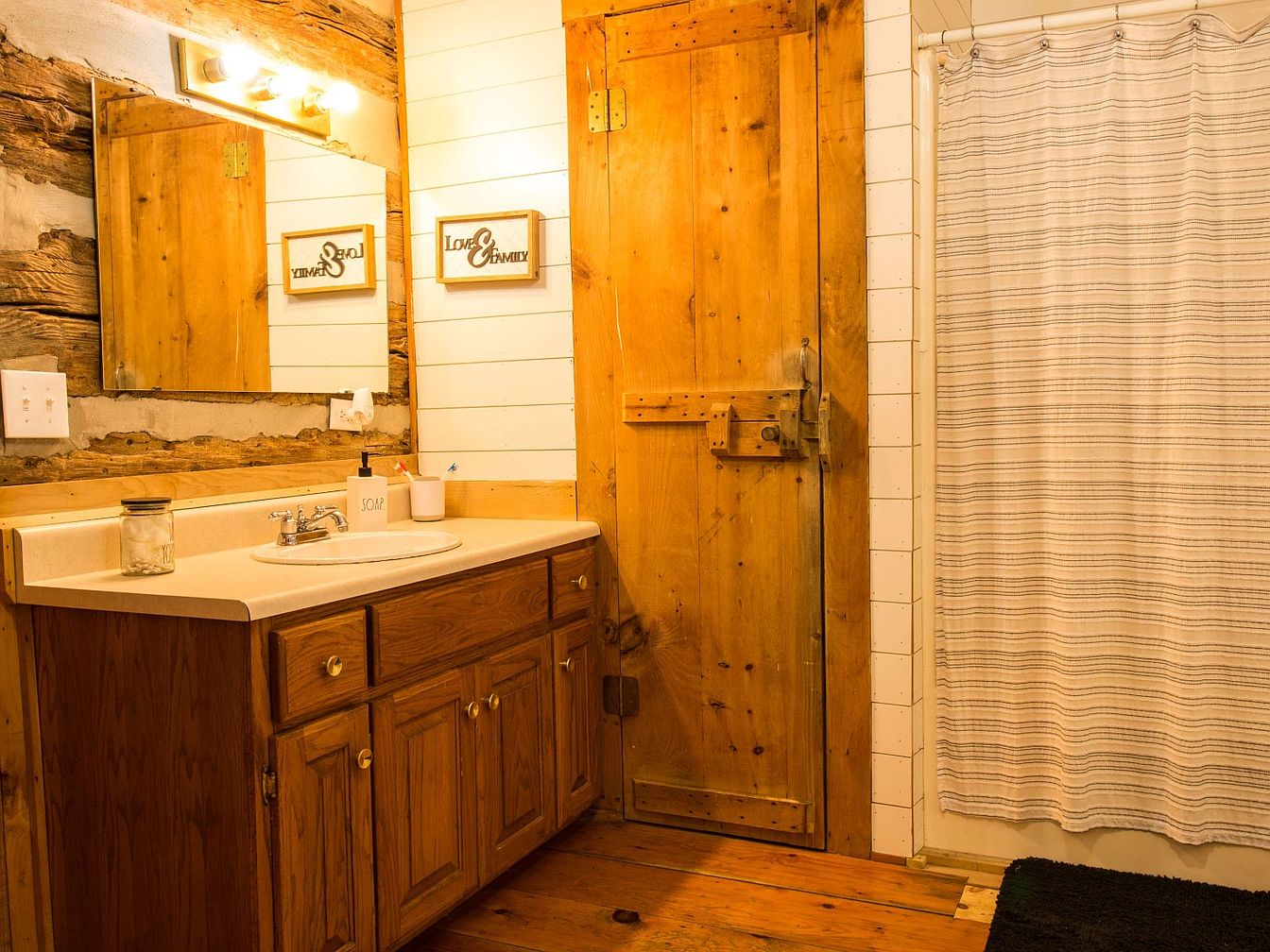 A cozy family bathroom with a rustic, inviting atmosphere featuring honey-toned wood accents throughout. The large wooden vanity, with ample cabinetry for storage, supports a cream countertop and sink, making it practical for family use. A wide flat mirror is set above, bordered by warm lighting, providing a welcoming glow and excellent visibility. The space showcases charming country touches, like a wooden door with traditional latching hardware and a pair of positive message signs reading ‘Love & Family’ on the wall. A striped shower curtain and black bath mat add a soft, comfortable touch, blending seamlessly with the log and shiplap wall textures.