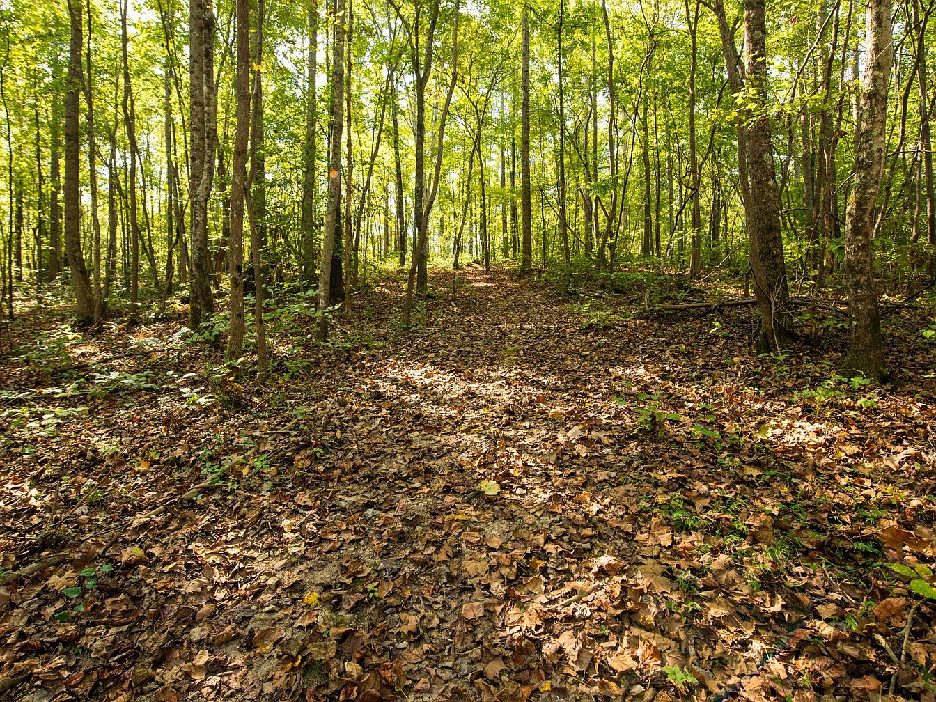 Expansive backyard featuring a serene stretch of mature forest with slender trunks rising from a soft, leaf-covered ground. Gentle sunlight filters through the high canopy, creating a peaceful glow and dappled shadows throughout the space. The earthy brown and rich green color scheme creates a natural, inviting atmosphere perfect for family activities like nature walks, outdoor play, or picnics. With plenty of open space between the trees, children can safely explore while adults relax nearby. The presence of native plants and shaded areas adds both beauty and privacy, making this outdoor setting ideal for enjoying nature at home.