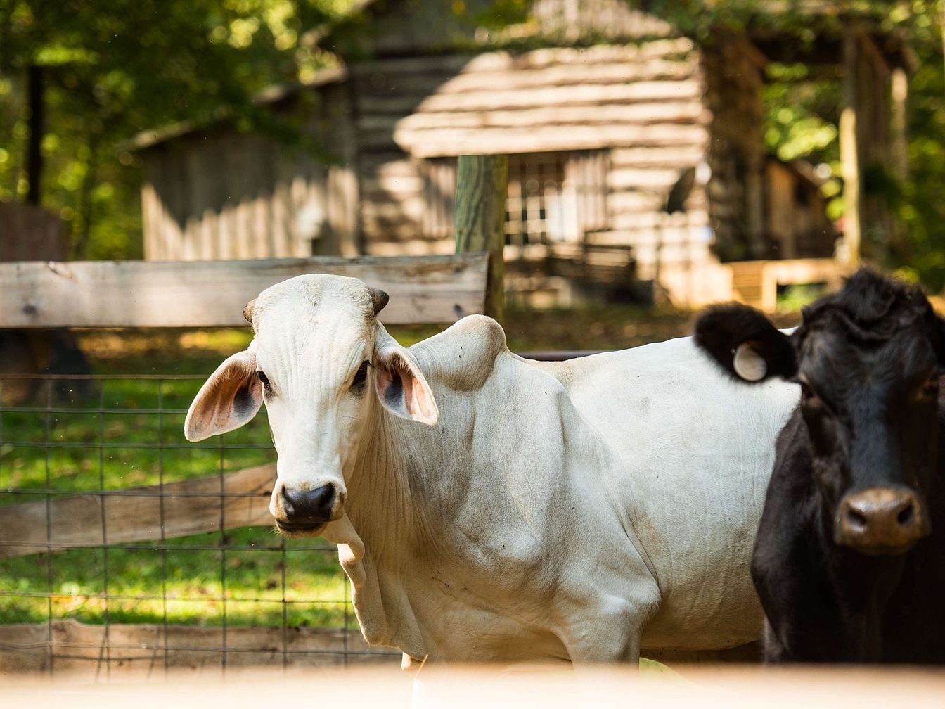 A rustic wooden and wire fence encloses the front yard, with two cows, one white and one black, standing closely together in the foreground. Lush green grass and dappled sunlight create a warm, inviting feel, perfect for a family seeking an outdoor space for children to play or for those interested in small-scale farming. Behind the fence, a historic-looking wooden home with a weathered exterior sits amid leafy trees, evoking a sense of tranquil country living. The overall scene is peaceful and safe, offering plenty of open, secure space for family activities and enjoyment with nature.