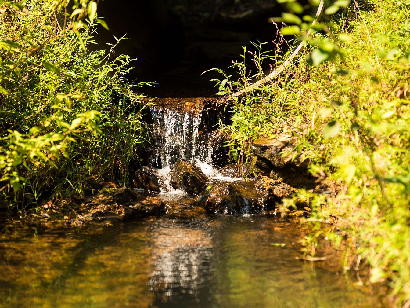 A picturesque garden stream features gently flowing water cascading over smooth rocks into a small, clear pond surrounded by lush green foliage. Natural sunlight highlights the vivid green tones of the grasses and plants growing along the stream’s banks, creating a tranquil and vibrant outdoor environment ideal for family relaxation or children’s play. The soothing sound of running water offers a calming backdrop, and the natural landscaping provides opportunities for outdoor activities, wildlife observation, and peaceful retreats. This outdoor space combines rustic charm with family-friendly functionality, making it perfect for gatherings or quiet moments in nature.
