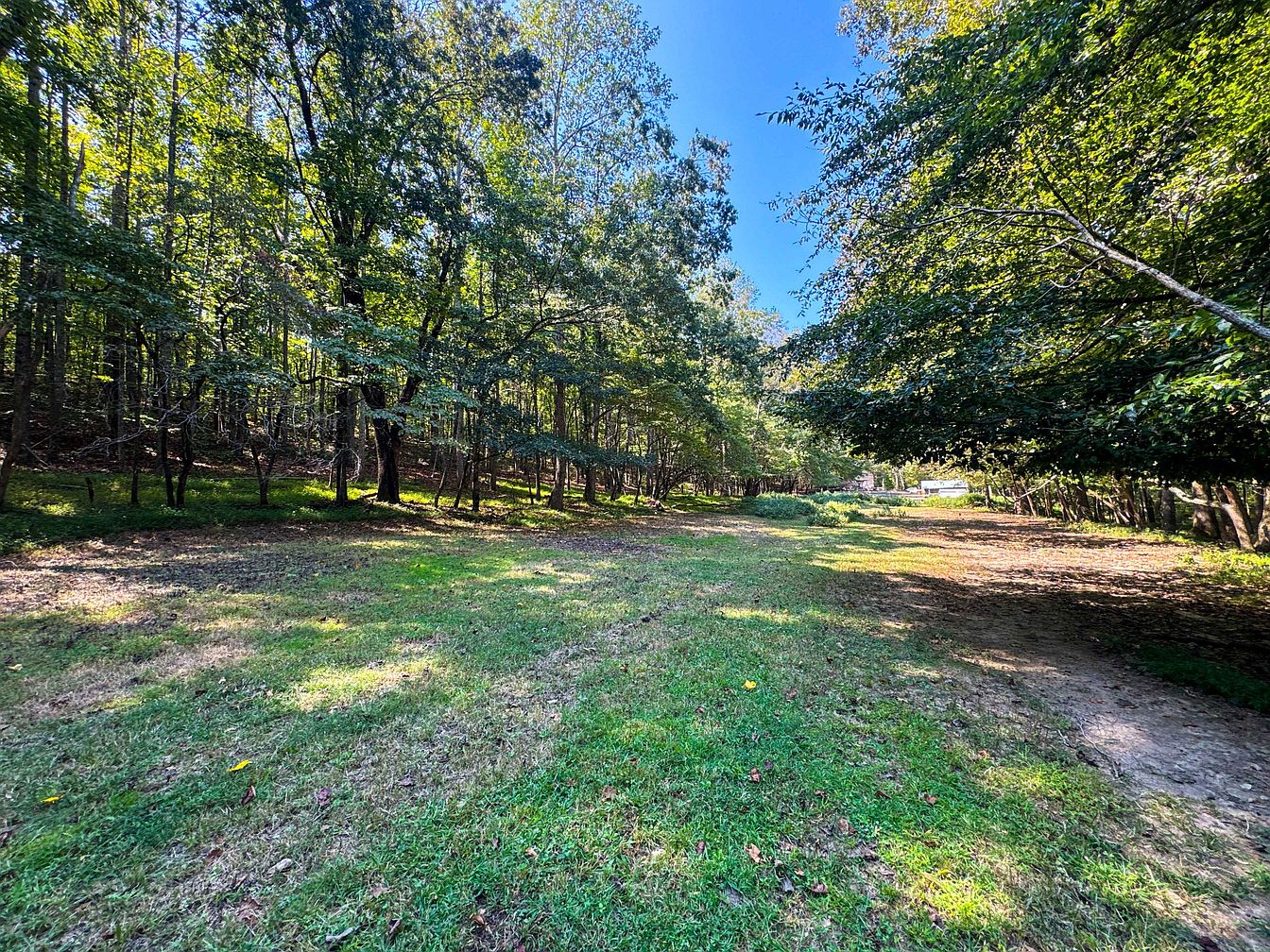 Expansive, sun-dappled backyard features a wide grassy area bordered by mature trees, offering ample space for children to play and families to gather. The gently sloping lawn transitions into a wooded section, adding both privacy and natural beauty. The color palette includes vibrant greens from the grass and leafy canopy, contrasted by patches of earth and filtered sunlight. Clear blue skies enhance the inviting, peaceful atmosphere. This open outdoor space is perfect for family activities, gardening, or relaxing in nature, combining a sense of seclusion with plenty of room to explore and enjoy the outdoors.
