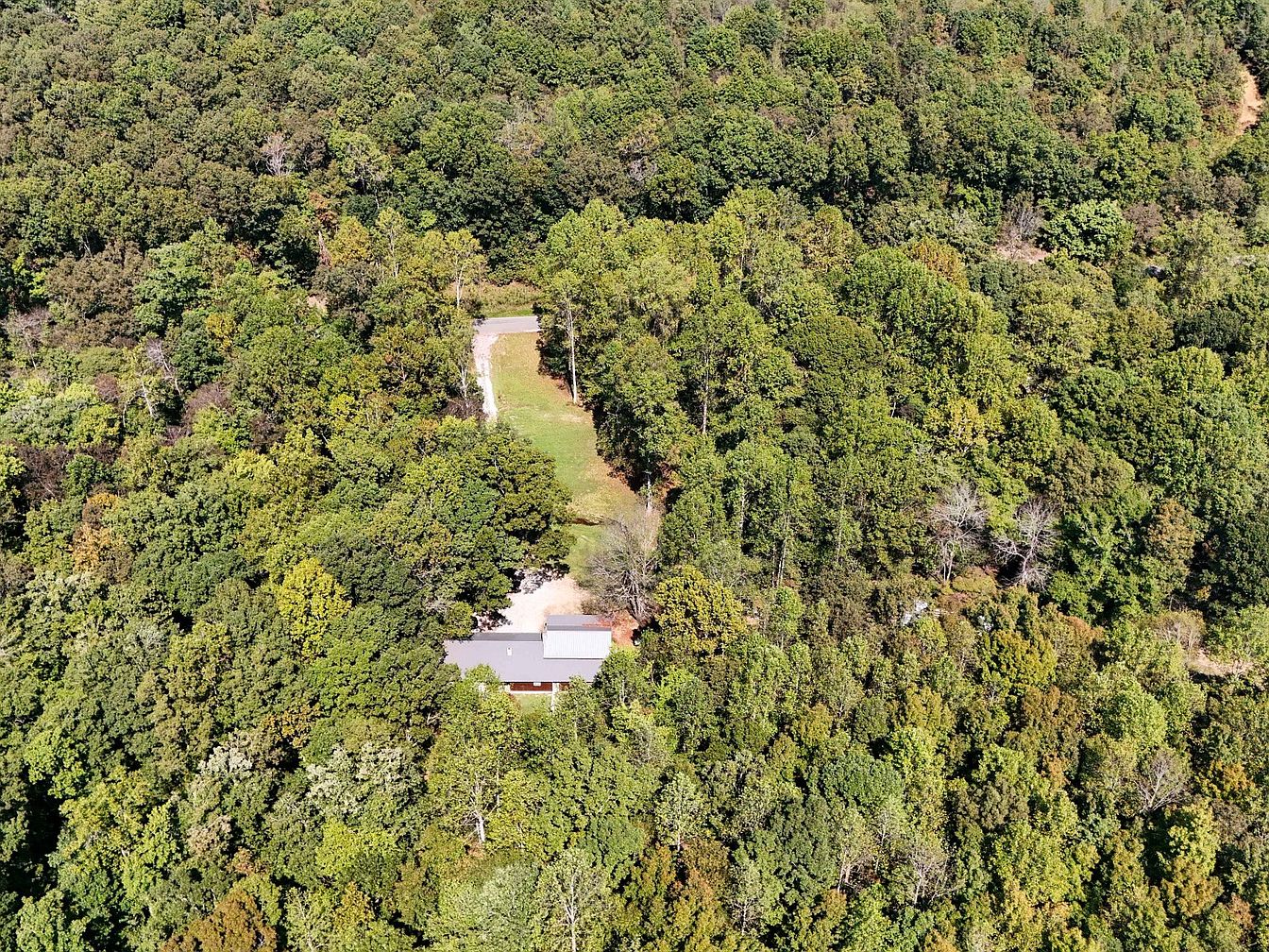 Nestled deep within a lush green forest, this aerial view captures a secluded driveway leading to a family home surrounded by nature. The home’s gray roof peeks out from dense treetops, creating a sense of peace and privacy. The shaded driveway provides a safe space for children to bike or play, while the open grassy entryway welcomes gatherings and outdoor activities. The surrounding woodland offers calm scenery and ample space for exploration, supporting family adventures and relaxation. The natural foliage showcases rich green hues, ensuring year-round beauty and a tranquil environment perfect for a growing family.