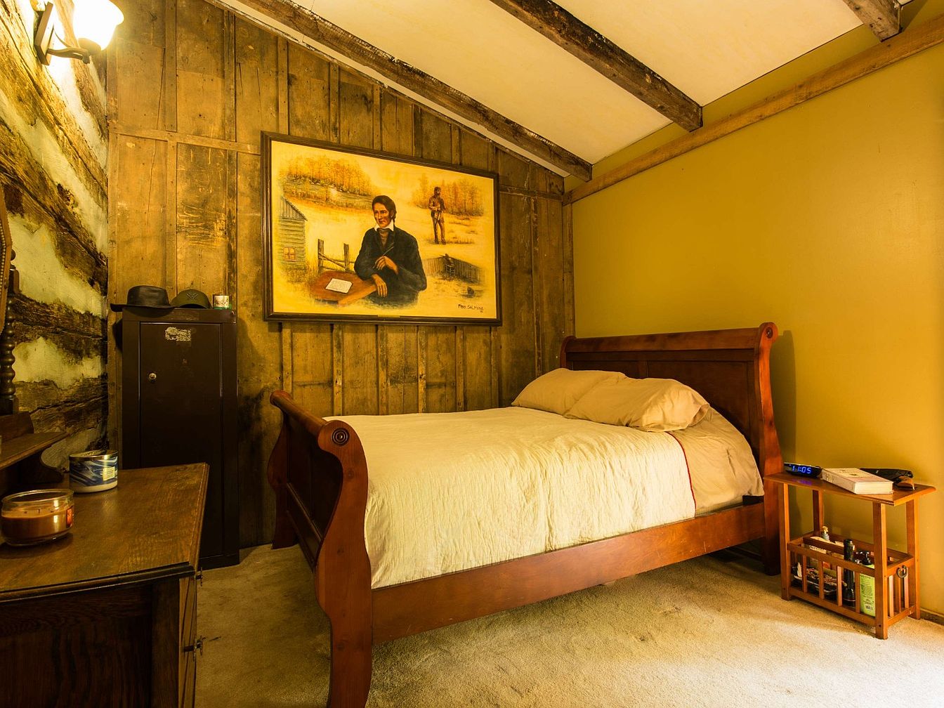 A cozy bedroom with rustic charm, featuring a sloped ceiling lined with exposed wooden beams that add character and warmth. The bed, crafted from polished wood with elegant curves, sits centrally against one wall, dressed in light cream bedding and matching pillows. One wall showcases weathered wooden planks, enhancing the home’s nostalgic, log cabin atmosphere, and displays a large framed painting. Warm yellow paint covers the adjoining wall, complementing the earthy tones of the carpet and wooden furniture. A secure cabinet, sturdy side tables, and soft lighting make this room both inviting and family-friendly, perfect for restful nights.