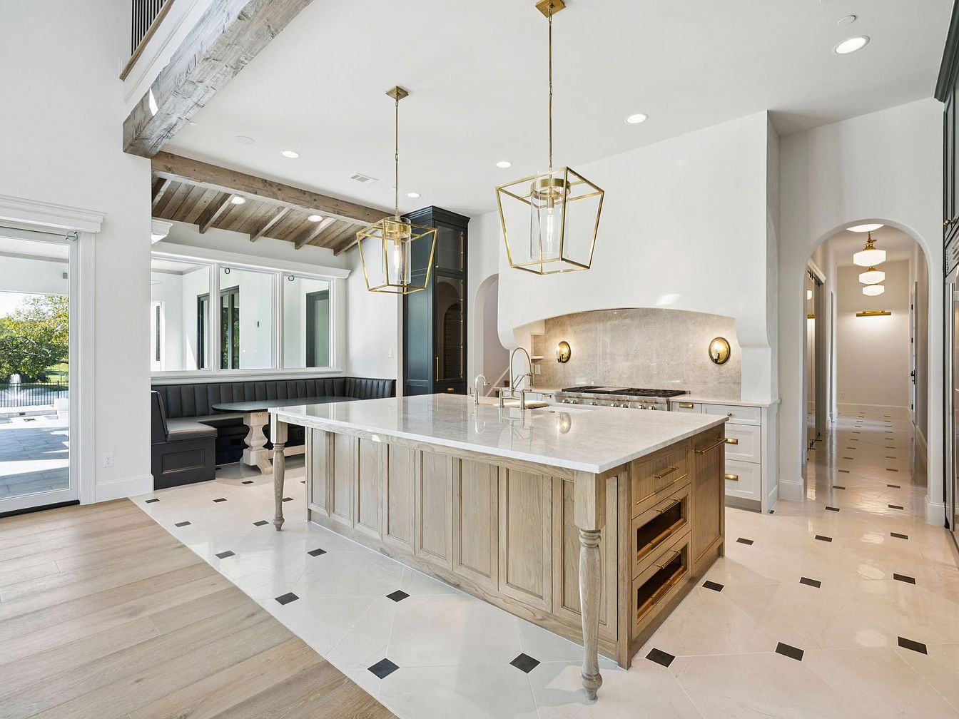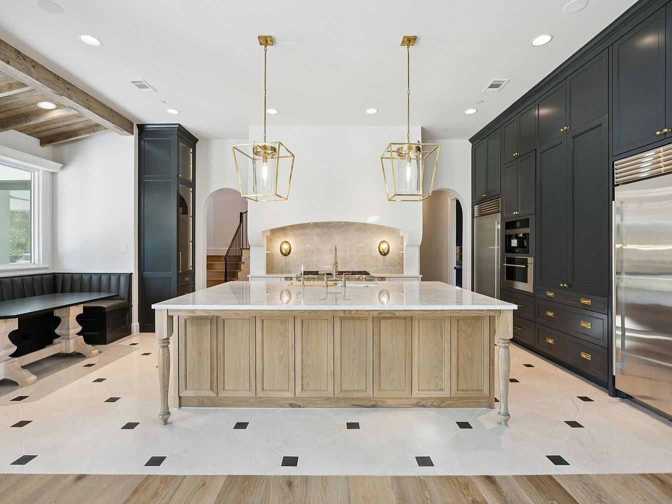 This kitchen features a spacious island with a light wooden finish, showcasing intricate paneling. A glossy white countertop contrasts beautifully with the island’s natural wood. Above, geometric pendant lights in gold provide a touch of modern elegance. The room boasts high ceilings with exposed wooden beams, enhancing the rustic charm. A cozy built-in bench with dark upholstery complements the sleek cabinetry in deep black. The flooring combines light hardwood with black and white tiles arranged in a stylish pattern, providing visual interest. Large windows flood the space with natural light, seamlessly integrating indoor and outdoor living.