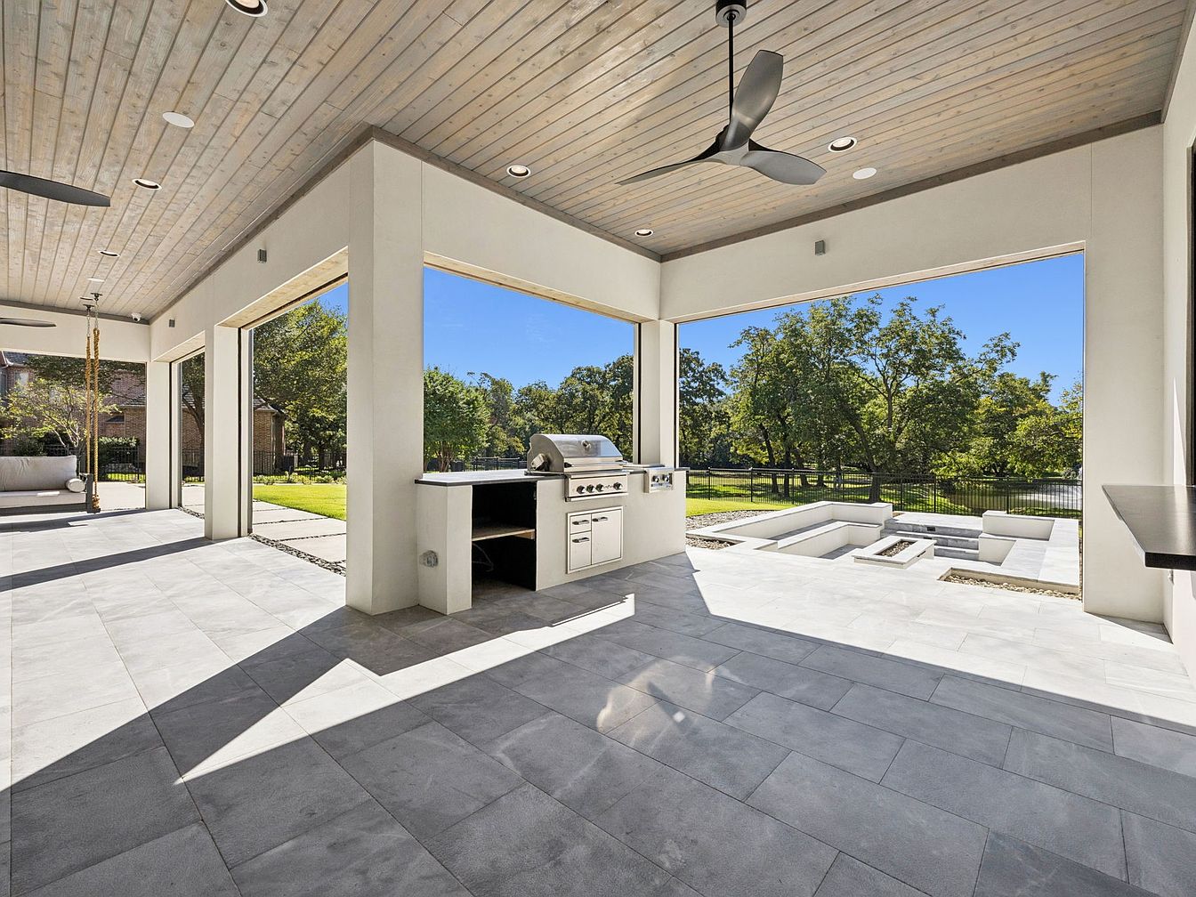 This outdoor patio area features a spacious layout with polished gray tile flooring, complementing the modern aesthetic. The ceiling, adorned with wooden beams, adds warmth to the space, while large, open glass panels invite natural light and offer seamless views of the lush green surroundings. A built-in outdoor kitchen with a stainless-steel grill enhances functionality, making it ideal for gatherings. A minimalist design is echoed in the lack of clutter and the thoughtfully placed seating area, fostering a sense of relaxation. The blend of elegant materials and open space creates a perfect harmony between indoor comfort and outdoor enjoyment.