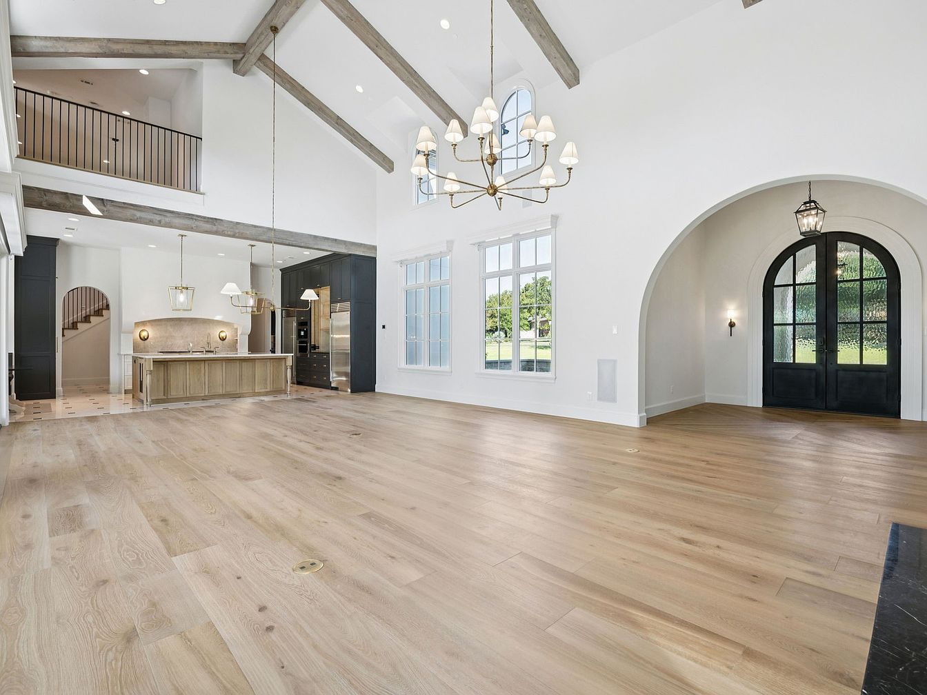 An expansive living room featuring high, vaulted ceilings with exposed wooden beams adds character. The space is bathed in natural light from large windows, highlighting the pale wooden flooring that creates warmth. A modern kitchen area is seamlessly integrated, showcasing a spacious island with a natural wood finish, complemented by sleek black cabinetry. Elegant light fixtures hang from the ceiling, enhancing the sophisticated aesthetic. An inviting arched doorway leads into a grand entry, accentuated by a rich, dark front door framed with decorative glass. The overall design balances contemporary elements with classic architectural details, creating a serene environment.