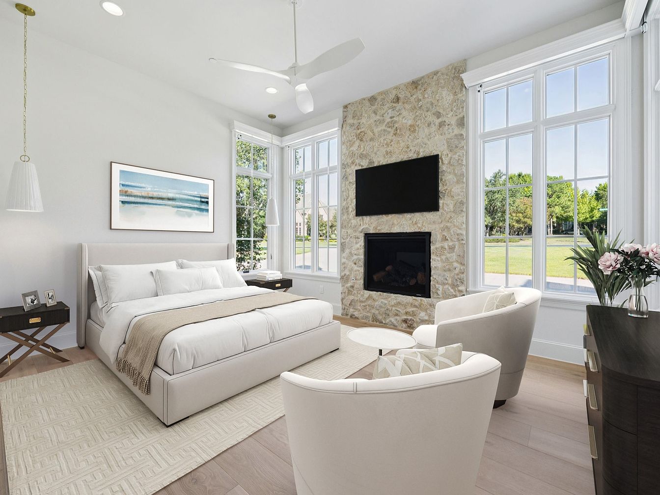 This serene bedroom features a soft color palette of whites and light grays, complemented by warm wooden tones. A plush, upholstered bed sits at the center, layered with a stylish gray throw and crisp white bedding. Flanking the bed are elegant nightstands with modern lamps. Large windows, adorned with sheer curtains, provide natural light and an inviting view of the greenery outside. A textured area rug adds warmth beneath the furniture, while the stone accent wall behind the bed creates a rustic yet contemporary backdrop. Two cozy armchairs invite relaxation near the stylish fireplace.
