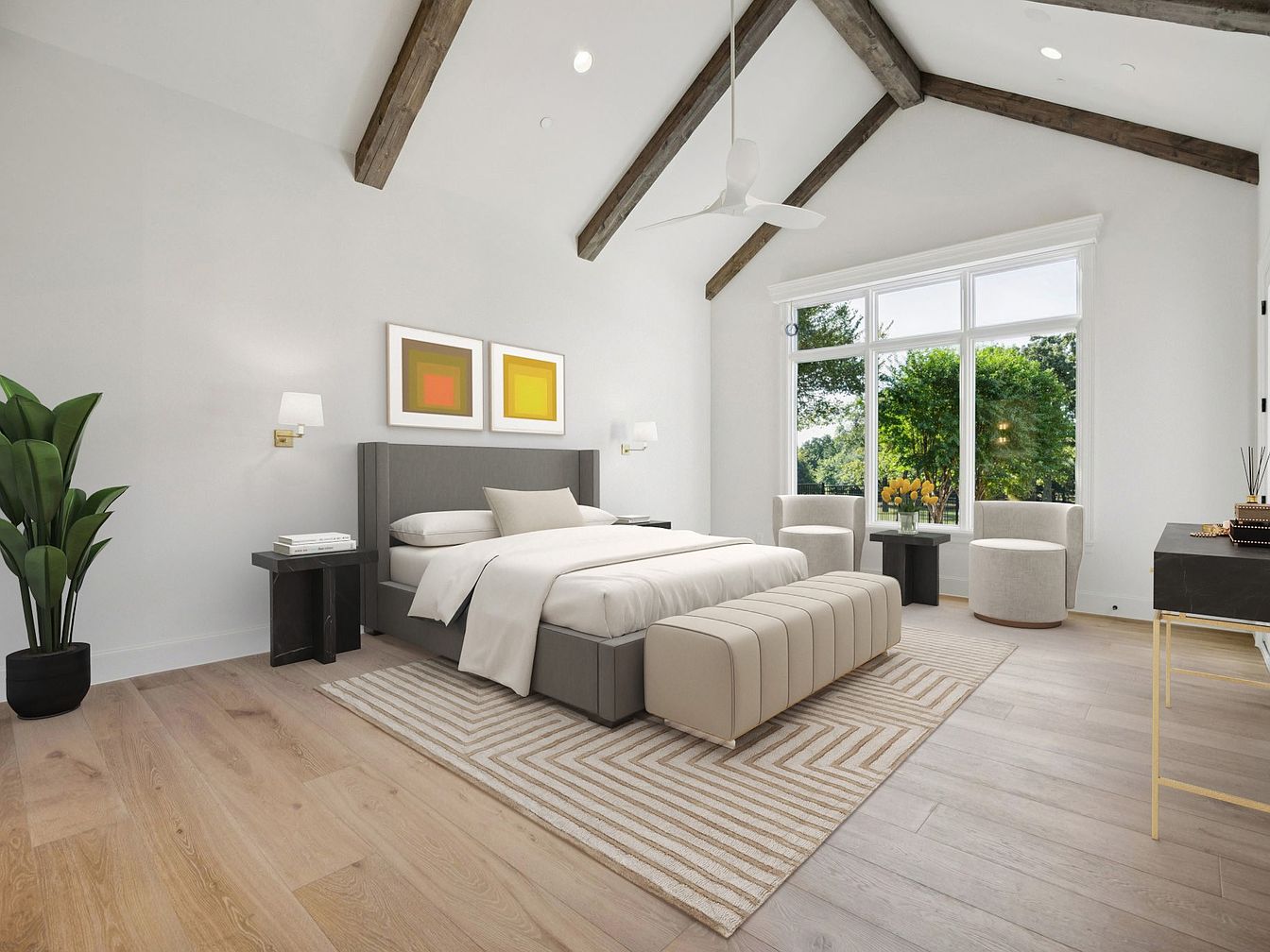 This modern bedroom features a spacious layout characterized by high ceilings with exposed wooden beams. The walls are painted in soft white, enhancing the sense of openness. A large bed is positioned centrally, adorned with neutral bedding and set against a stylish gray upholstered headboard. Flanking the bed are sleek nightstands with minimalist lamps that contribute to the clean aesthetic. Two cozy armchairs are paired with a small table, inviting relaxation. The floor is finished in light wood, complemented by a striped area rug that adds texture. Large windows offer a tranquil view of greenery outside.