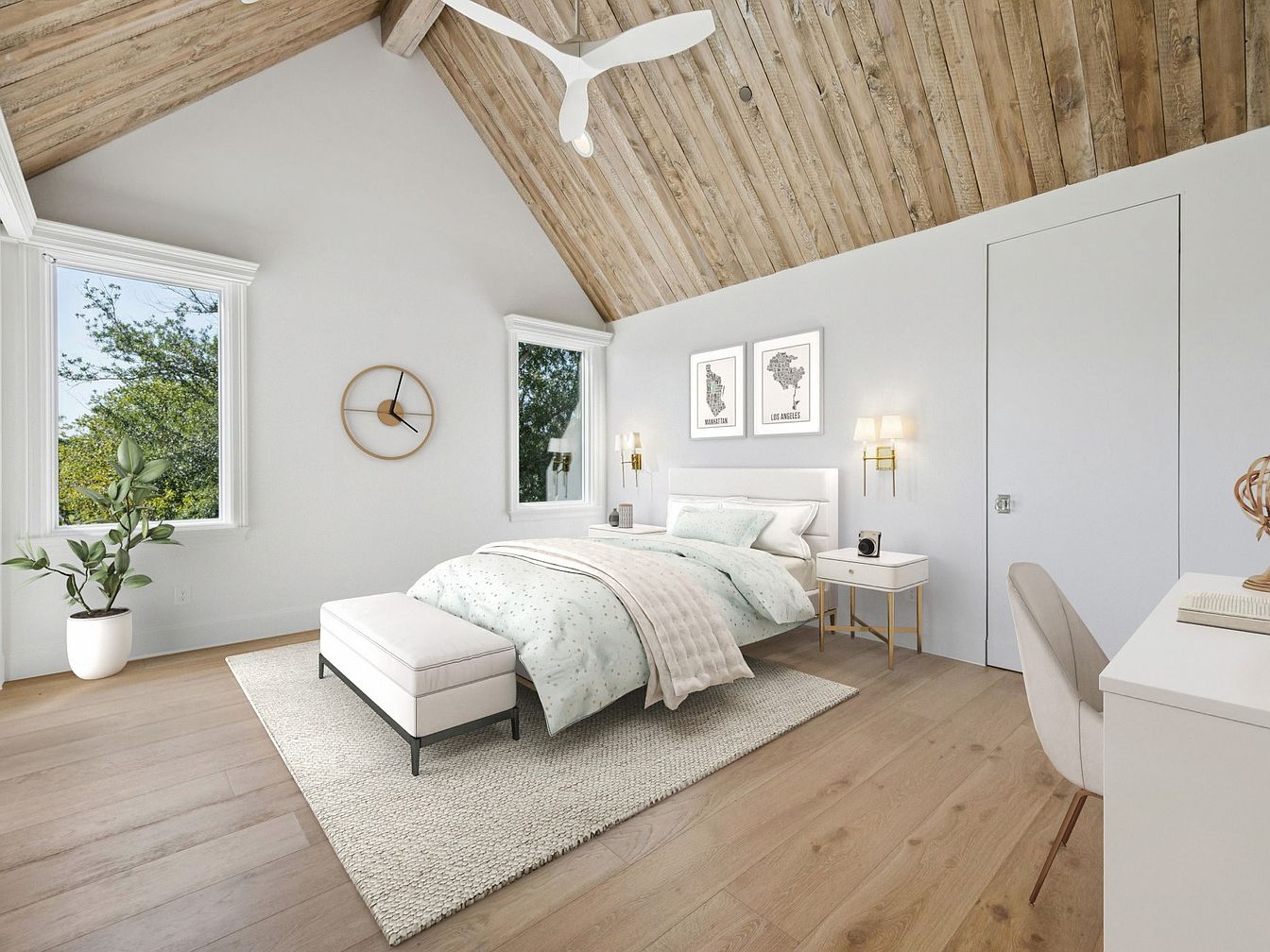 This bedroom features a vaulted ceiling with exposed, rustic wood beams, enhancing its spacious feel. Neutral, soft colors dominate the palette, with a light gray wall and warm-toned wooden flooring. Centered is a minimalist bed adorned with a delicate mint-colored duvet and layered blankets, flanked by modern gold sconces. A plush, cream-colored bench sits at the foot of the bed. Natural light floods the space through large windows, accentuating a potted plant in the corner. A sleek, white desk with a sophisticated chair adds a functional touch, while art prints on the wall add character without overwhelming the serene aesthetics.