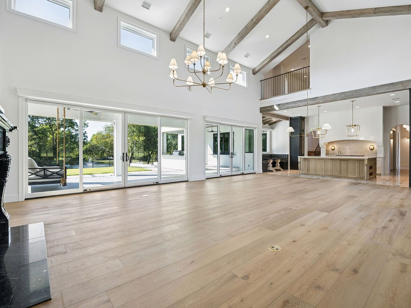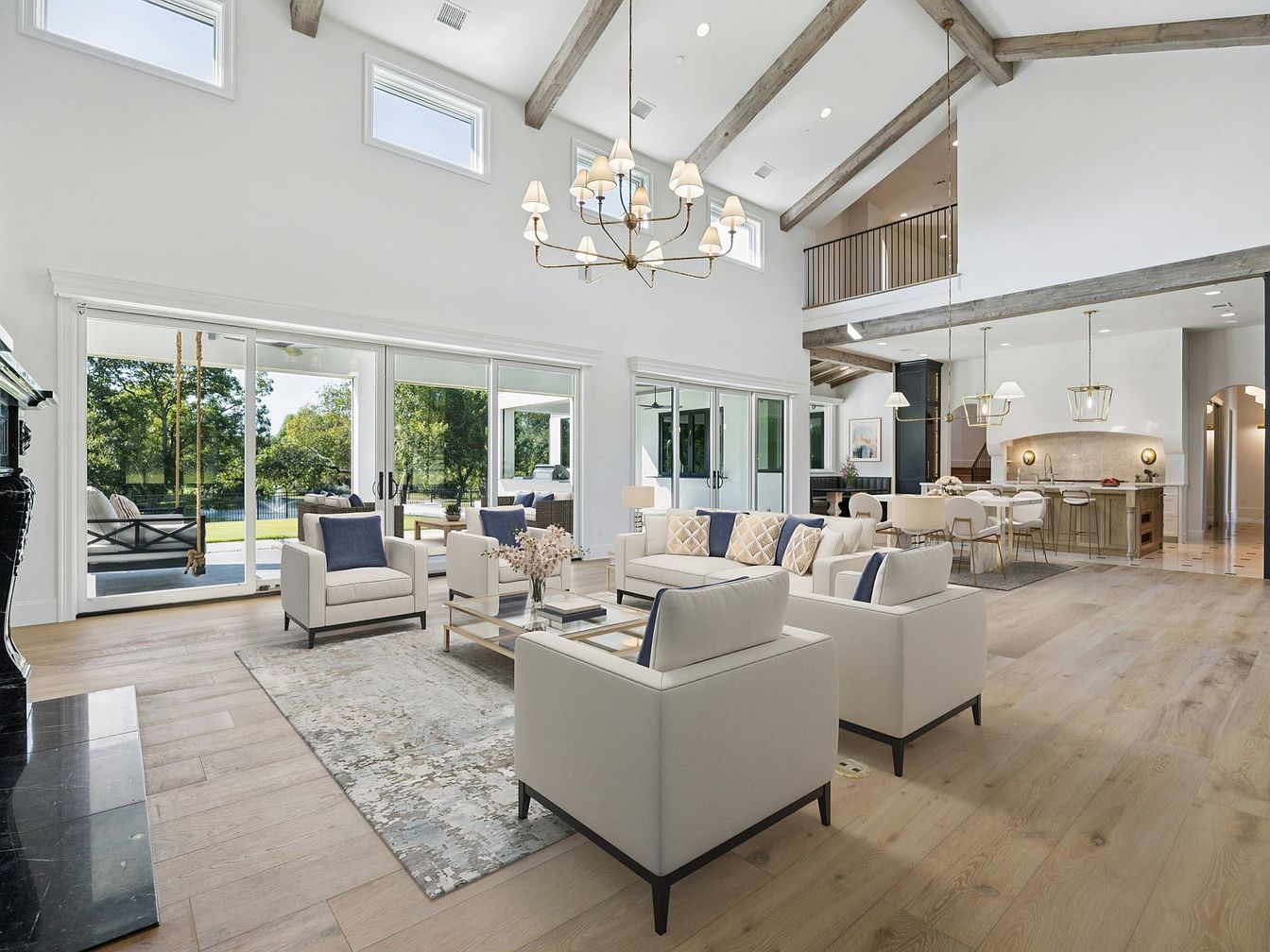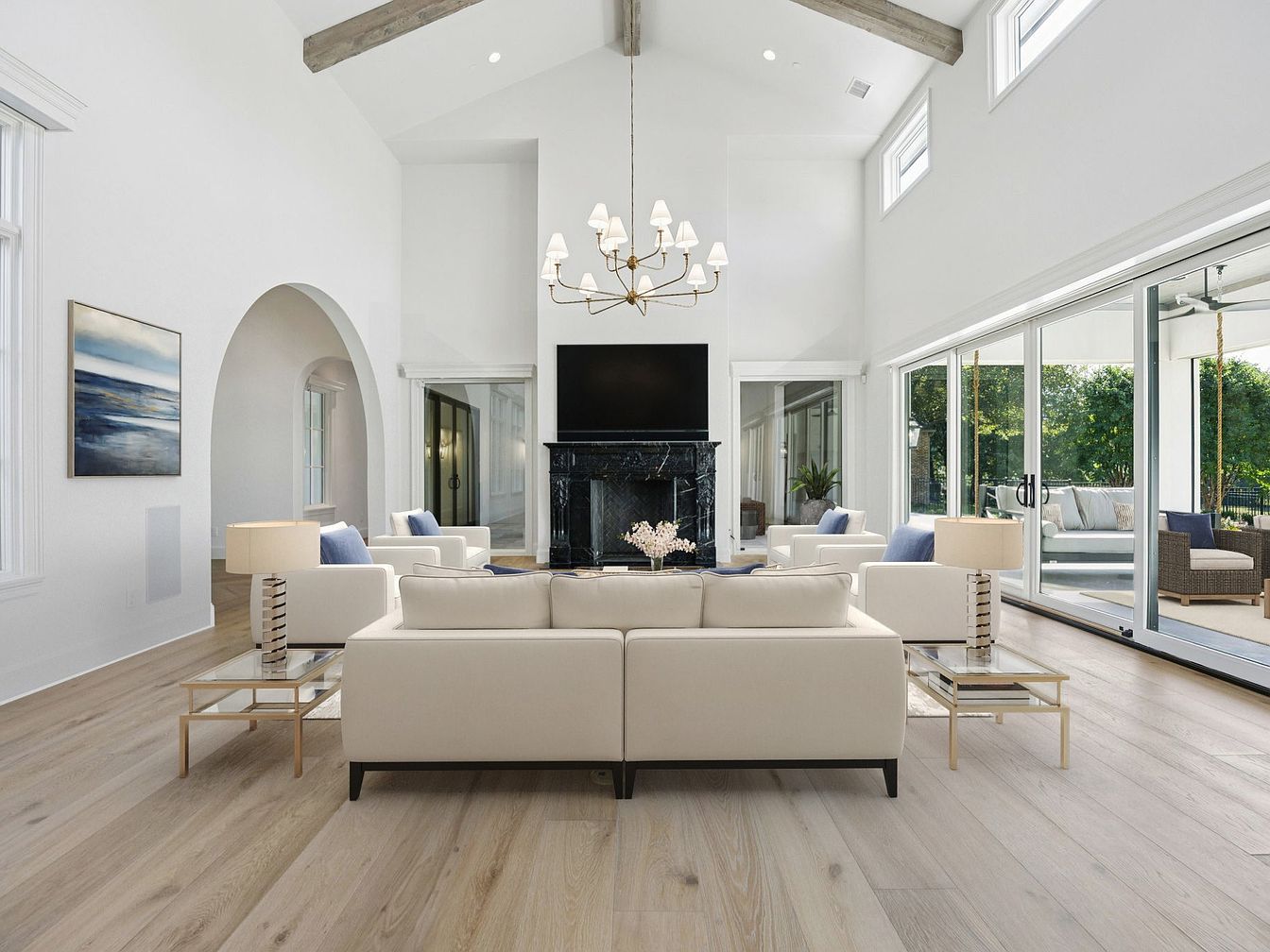 This expansive open living space blends modern comfort with rustic charm. The high ceiling features exposed wooden beams, enhancing the airy ambiance. Natural light floods through large sliding glass doors, connecting the indoors with lush greenery outside. A stunning chandelier hangs centrally, complementing the soft neutral color palette of the walls and flooring. The light oak hardwood floor adds warmth while a sleek, modern fireplace anchors one side of the room. The kitchen area showcases sophisticated cabinetry, complemented by elegant pendant lighting, inviting both relaxation and entertaining in this beautifully designed area.