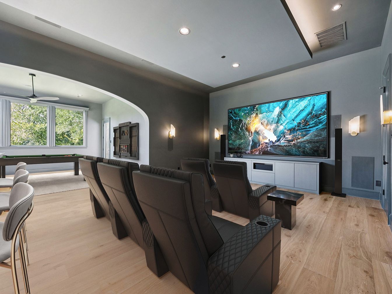 This contemporary media room features plush seating arranged in a half-circle facing a large flat-screen TV mounted on a stylish gray wall. Rich earth tones highlight the space, with a textured wooden floor adding warmth. Large windows provide natural light, framed by simple white trims, and balance the darker cinematic theme. To the side, a sleek billiards table enhances leisure activities, while modern sconces on the walls lend subtle illumination. The room’s layout promotes relaxation and entertainment, merging comfort with a sophisticated aesthetic, ideal for movie nights or gatherings.
