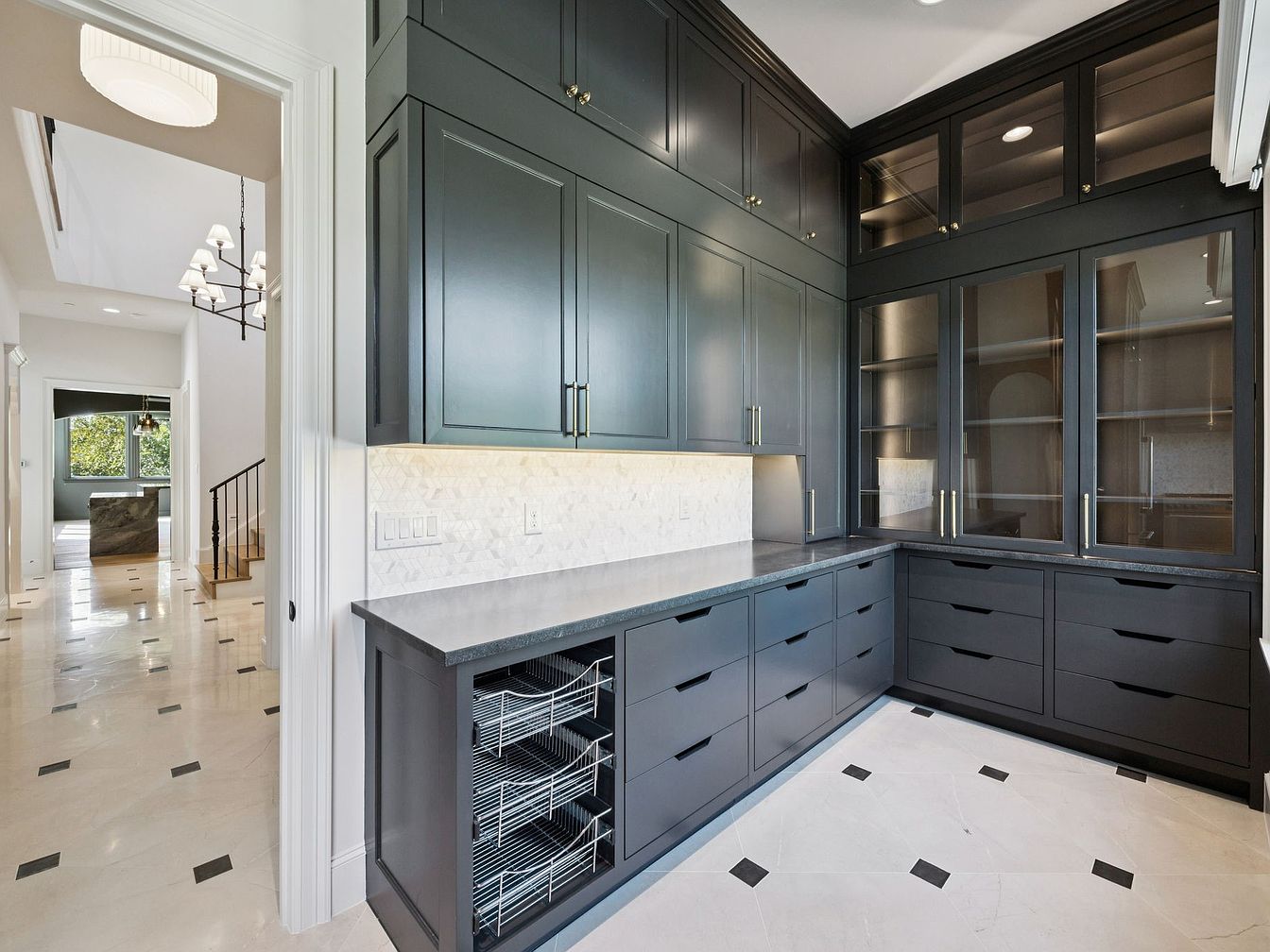 The kitchen showcases rich dark cabinetry, emphasizing sleek lines and modern aesthetics. A combination of upper glass-fronted cabinets and solid lower cabinets offers a refined storage solution. The countertop made of dark stone contrasts beautifully with the lighter, textured backsplash, creating an inviting work area. Below, practical pull-out drawers are integrated within the cabinetry for easy access. The elegant marble flooring features black square inlays against a lighter background, enhancing the visual interest. A glimpse of a hallway and stairwell leading to other parts of the house introduces a bright atmosphere filled with natural light.