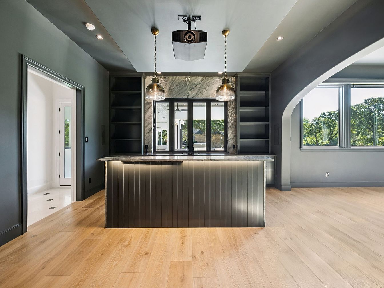 This modern kitchen bar features a sleek design with a minimalist aesthetic. The walls are painted in a soft gray, complementing the light hardwood floor that adds warmth to the space. A central island with a gray marble countertop serves as the focal point, showcasing unique veining. Above, two hanging pendant lights with a brushed gold finish provide stylish illumination. Open shelving lines one side for easy access to kitchenware. Large windows invite natural light, enhancing the airy feel, while the curvy architectural details of the room add character, blending contemporary and traditional elements seamlessly.