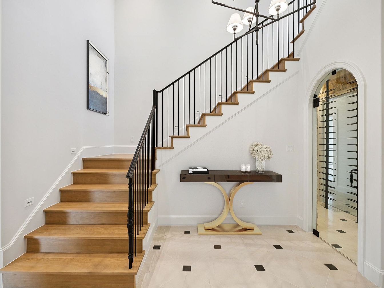 A welcoming entryway greets guests with a modern design. The staircase features warm wooden steps contrasting against sleek black metal railings, leading upward. A minimalist art piece adorns the wall beside the staircase, showcasing an abstract landscape in muted tones. Below, a stylish console table with a unique curved base provides a touch of elegance. This table holds a vase of delicate white flowers and two candles, adding warmth. The polished floor tiles alternate between light and dark squares, enhancing the aesthetic appeal. An ornate archway hints at another room, contributing to the airy, open atmosphere.