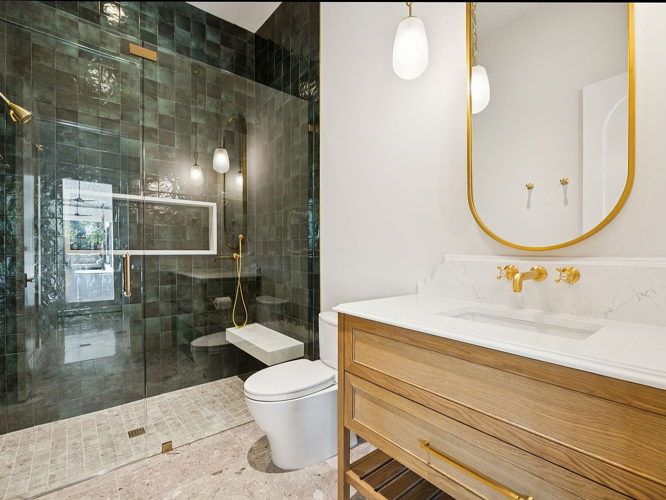 A modern bathroom features a luxurious design with a sleek glass shower enclosure, adorned with rich green tiles that create a sophisticated ambiance. The shower area includes a rainfall showerhead and a minimalist bench, contrasting beautifully with the polished marble flooring. A warm wood vanity is complemented by a white marble countertop, highlighting golden fixtures that elevate the space’s elegance. Above the sink, an oval mirror with a golden frame reflects the soft lighting from stylish pendant lights, enhancing the serene atmosphere. The combination of textures and colors establishes a harmonious yet contemporary aesthetic, perfect for relaxation.