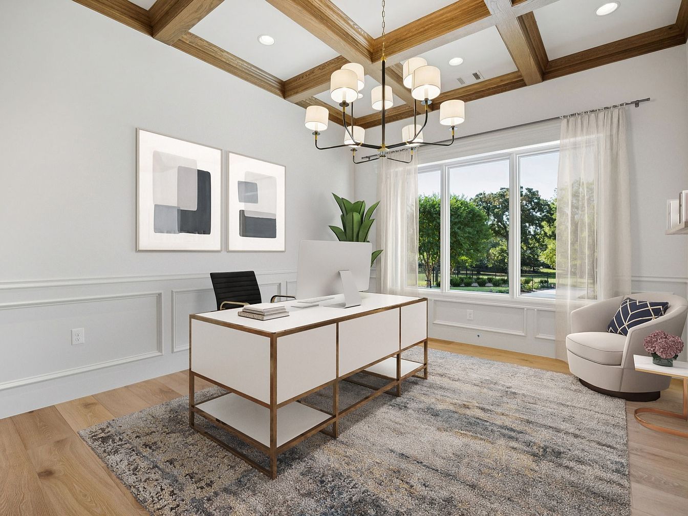 The home office showcases a modern design with a blend of elegance and functionality. A white desk with gold accents serves as the focal point, complemented by a sleek black chair. The walls feature a soft gray hue, enhancing the room’s airy feel. Natural light floods in through large windows adorned with sheer white curtains, providing a view of lush greenery outside. Two abstract framed artworks add a touch of sophistication, while a cozy armchair in the corner invites relaxation. A decorative plant brings life to the space, and the warm wooden floor adds warmth underfoot.