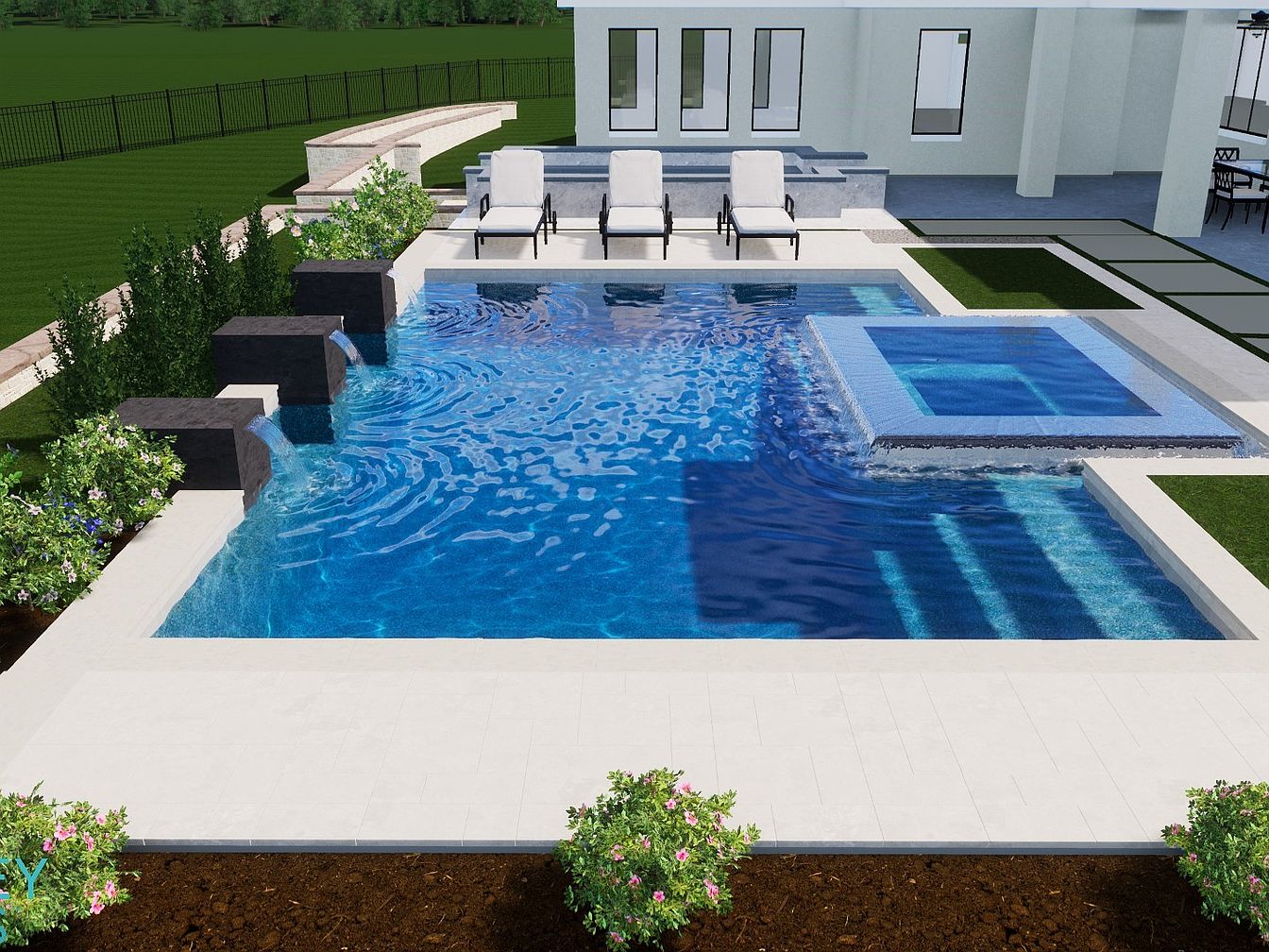 This outdoor space features a luxurious swimming pool with an adjoining spa. The main pool is a striking rectangular shape, emphasizing clarity of water, while the spa has a modern square design. Surrounding the pool are four elegant lounge chairs positioned to enjoy sun exposure, complemented by well-maintained landscaping with vibrant flowering shrubs. A textured stone wall creates a calming waterfall feature, enhancing the tranquil atmosphere. The patio is laid with large white tiles, contributing to a clean, bright aesthetic, while the lush green lawn brings a refreshing contrast. The crisp architectural lines of the house complete the serene setting.