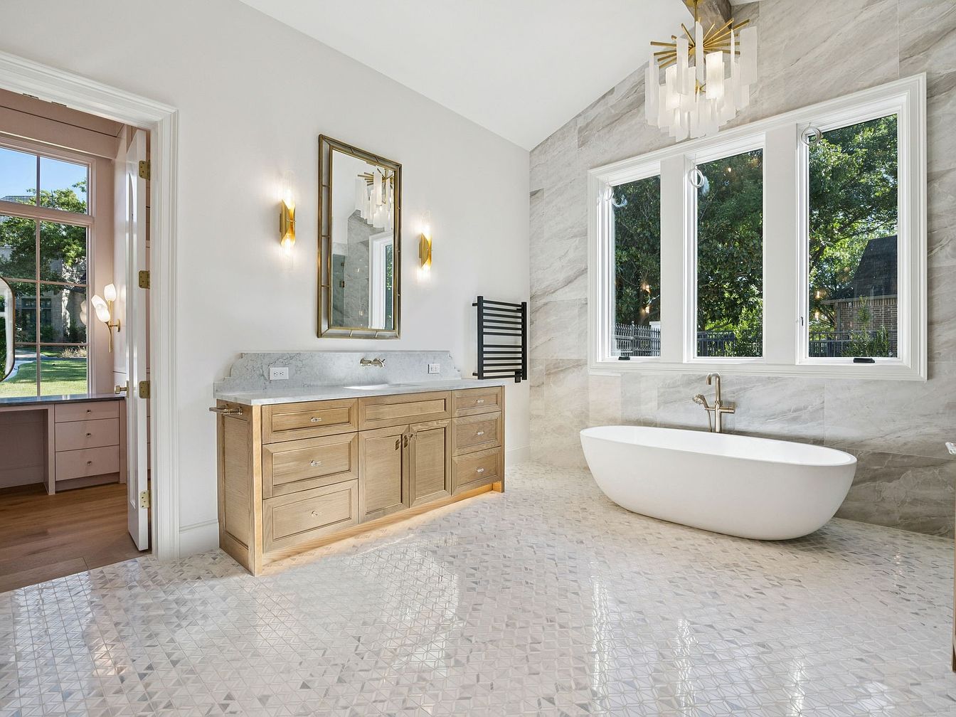 This spacious bathroom showcases a harmonious blend of contemporary elegance and comfort. The layout features a central freestanding tub, framed by large windows that flood the room with natural light. Light gray marble walls and a shimmering, mosaic tile floor create a soothing ambiance. A wooden vanity, with multiple sleek drawers and a polished countertop, complements the warmth of the wood against the cool tones of the tiles. Gold accents in the lighting fixtures and faucets add a touch of glamour, while the soft color palette enhances the tranquil atmosphere, making it a serene retreat in the home.