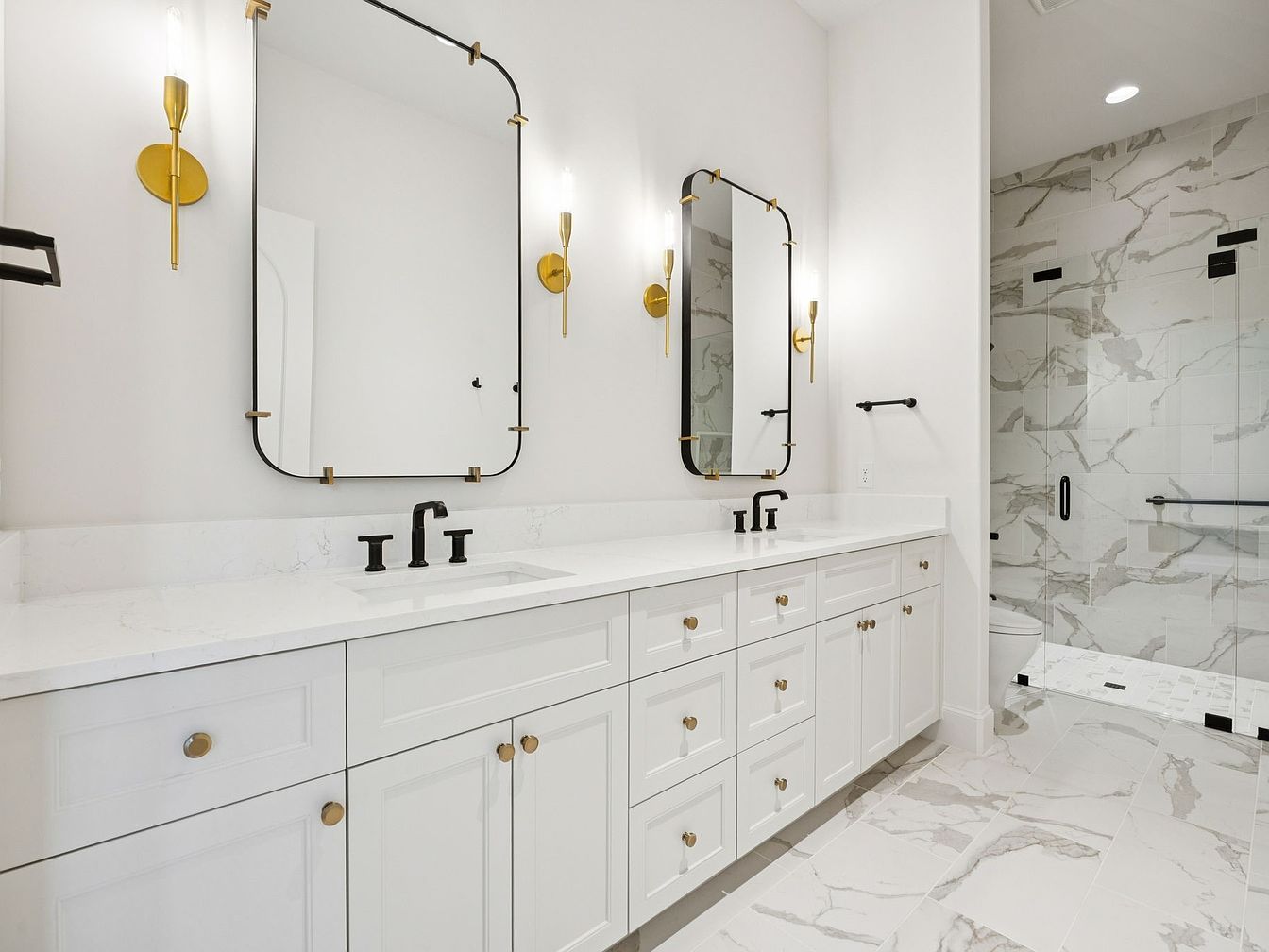 A modern bathroom features a spacious white vanity with sleek black faucet fixtures and golden accents. The countertop, adorned in a polished white marble, complements the cabinetry’s simple elegance. A pair of elegant, arched mirrors hangs above the sink, paired with stylish wall sconces that provide subtle illumination. The flooring showcases large, light-colored tiles that mimic marble, enhancing the airy feel. Adjacent, a glass shower enclosure reveals a stunning tiled wall with dramatic veining. The minimalist design is accentuated by a stark white color palette, creating a serene and luxurious ambiance.