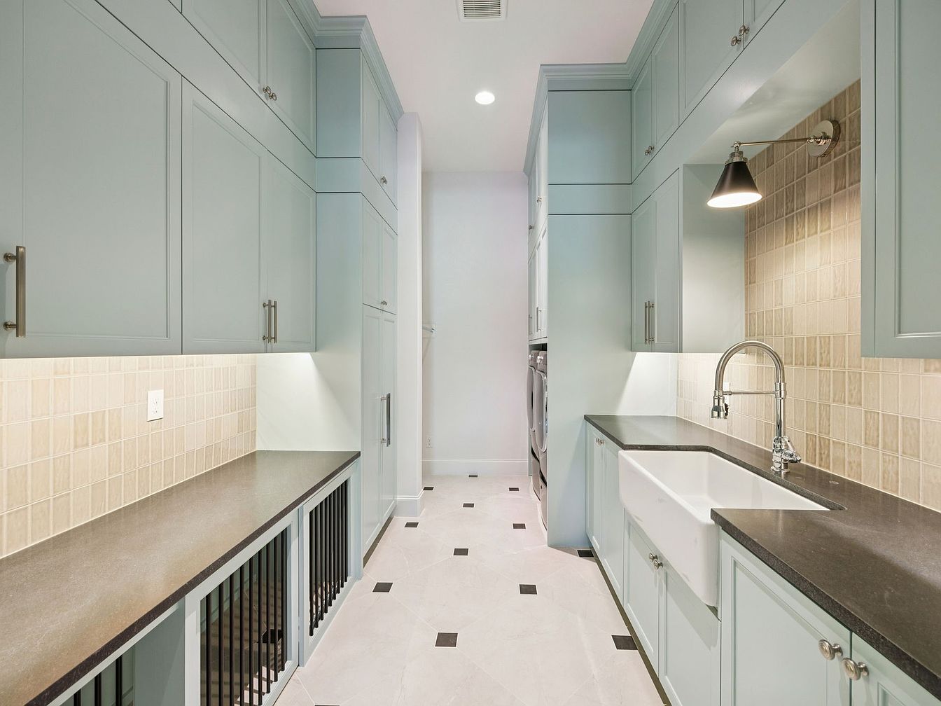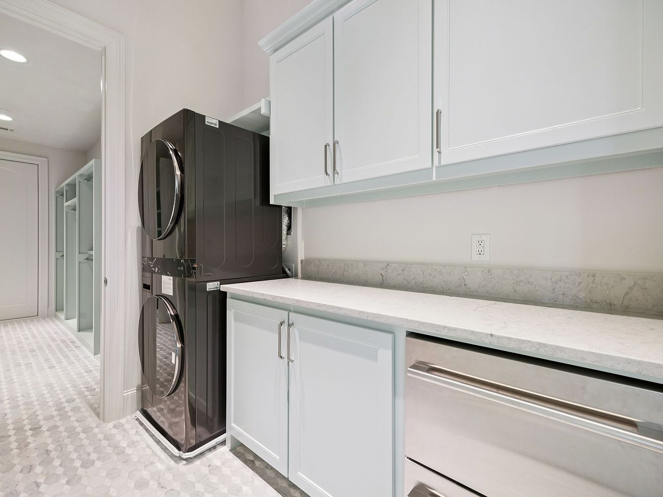 This laundry room features a streamlined design with modern appliances, including a sleek black washer and dryer. The cabinetry is a soft pastel blue, offering a calming aesthetic. A long marble countertop provides ample workspace, complemented by a subtle yet elegant backsplash. The flooring showcases a classic hexagonal tile pattern in shades of gray and white, enhancing the room’s contemporary style. Abundant LED lighting brightens the space, ensuring functionality while maintaining a clean look. The open layout seamlessly connects to a storage area, promoting organization within this essential household space.