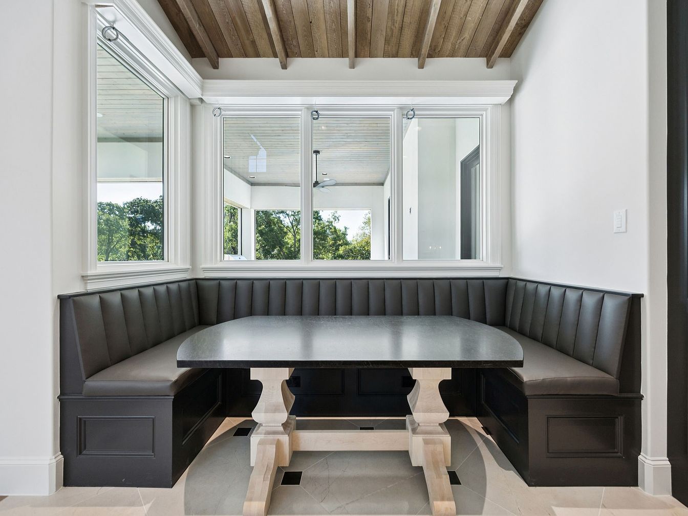 This breakfast nook features a cozy, corner seating arrangement with rich, dark leather upholstery. The curved banquette integrates seamlessly with the textured, wooden ceiling above, creating a rustic charm. A sleek, rectangular table with a solid black top and a robust, light-colored pedestal base centers the space, inviting casual dining. Floor-to-ceiling windows flood the nook with natural light, highlighting the contrast between the soft white walls and the deep hues of the seating. The tiled floor includes a subtle geometric pattern, enhancing the modern aesthetic while blending with the home’s historic character.
