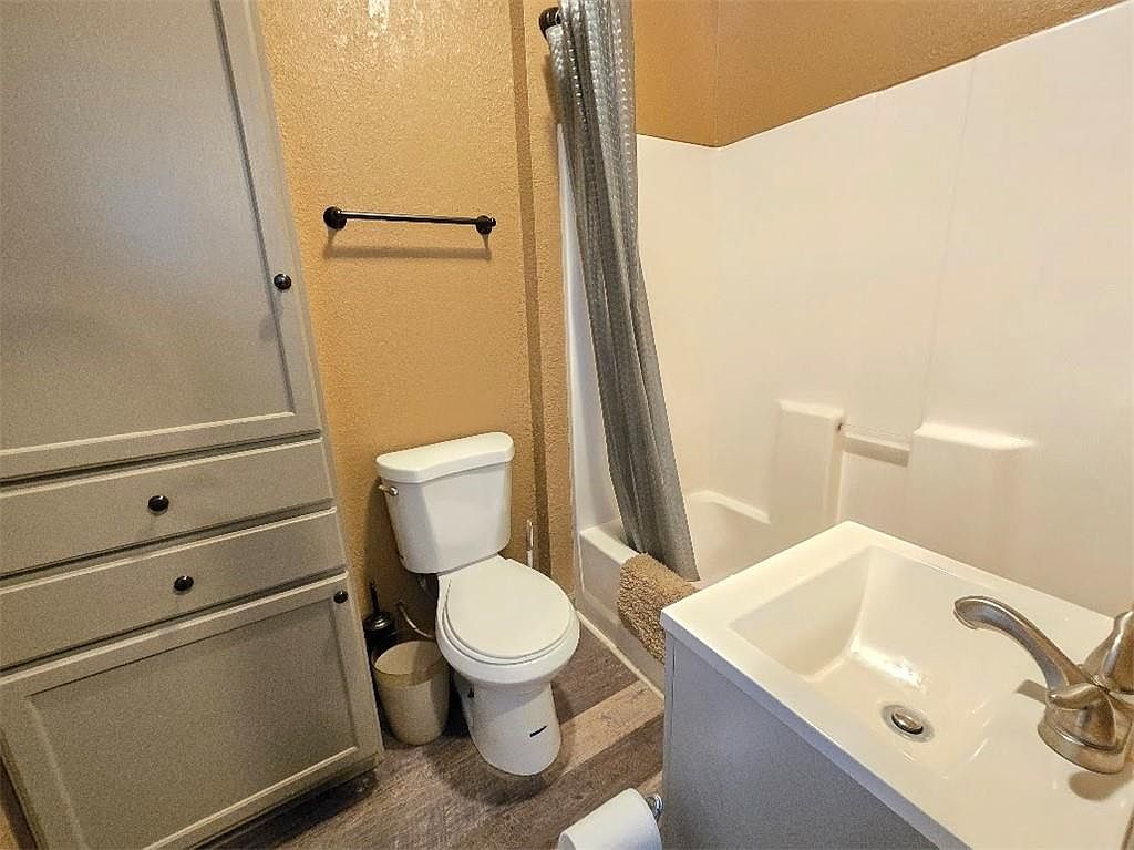 This bathroom features a compact layout with a functional design. A light taupe paint covers the walls, complementing the white plastic tub and shower enclosure, which is fitted with a gray shower curtain. The vanity area showcases a white sink with a sleek gold faucet, strategically placed next to the toilet. A wooden cabinet with a soft gray finish stands against the wall, providing storage space. Flooring consists of streamlined, textured tile that enhances a clean, modern aesthetic. Accessories include a towel bar and discreet wastebasket, contributing to the overall sense of order and simplicity in the space.
