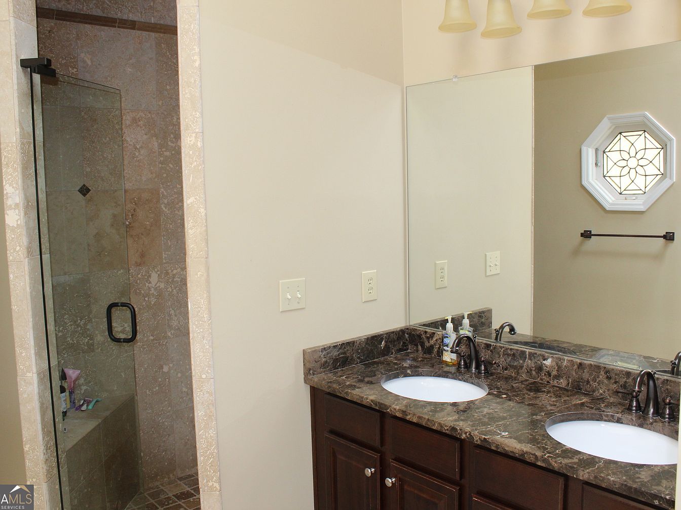 This bathroom features a dual vanity with a dark, rich wooden cabinet and a polished marble countertop, enhancing elegance. Two round sinks sit within the countertop, accented by vintage-style faucets in a deep bronze finish. A large, well-lit mirror above reflects the soft beige tones of the walls, creating a warm atmosphere. The adjoining shower, enclosed with glass, showcases textured stone tiles, seamlessly integrating modernity with classic decor. A striking octagonal window adds character, casting natural light into the space. Attention to detail is evident in the rich materials and thoughtful design, promoting both functionality and aesthetic appeal.