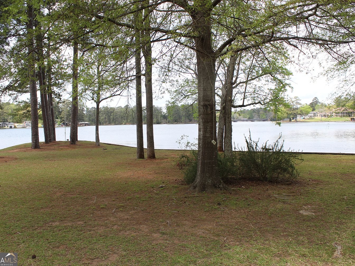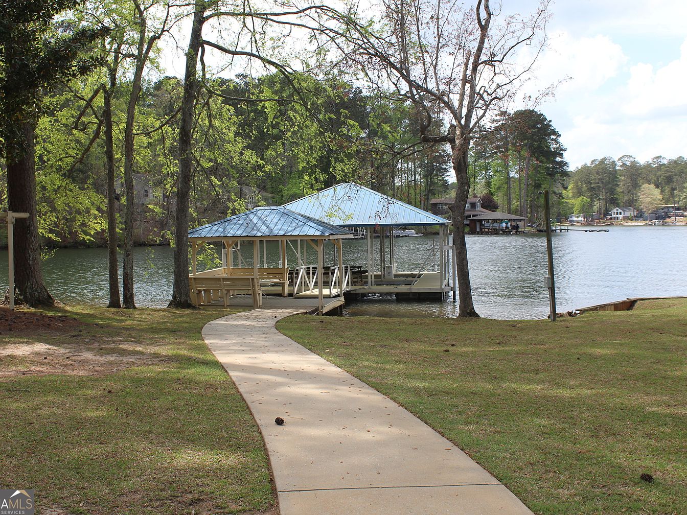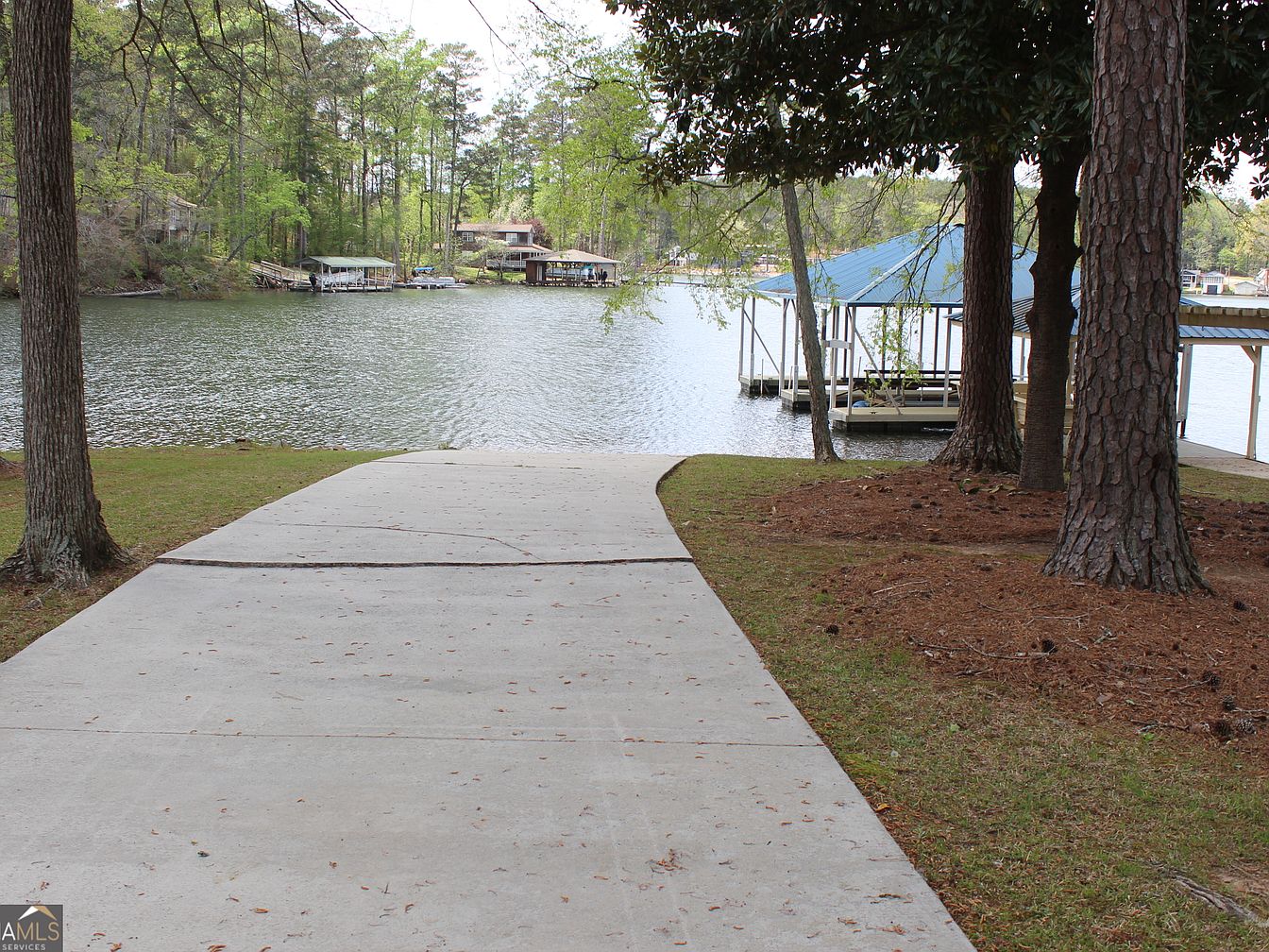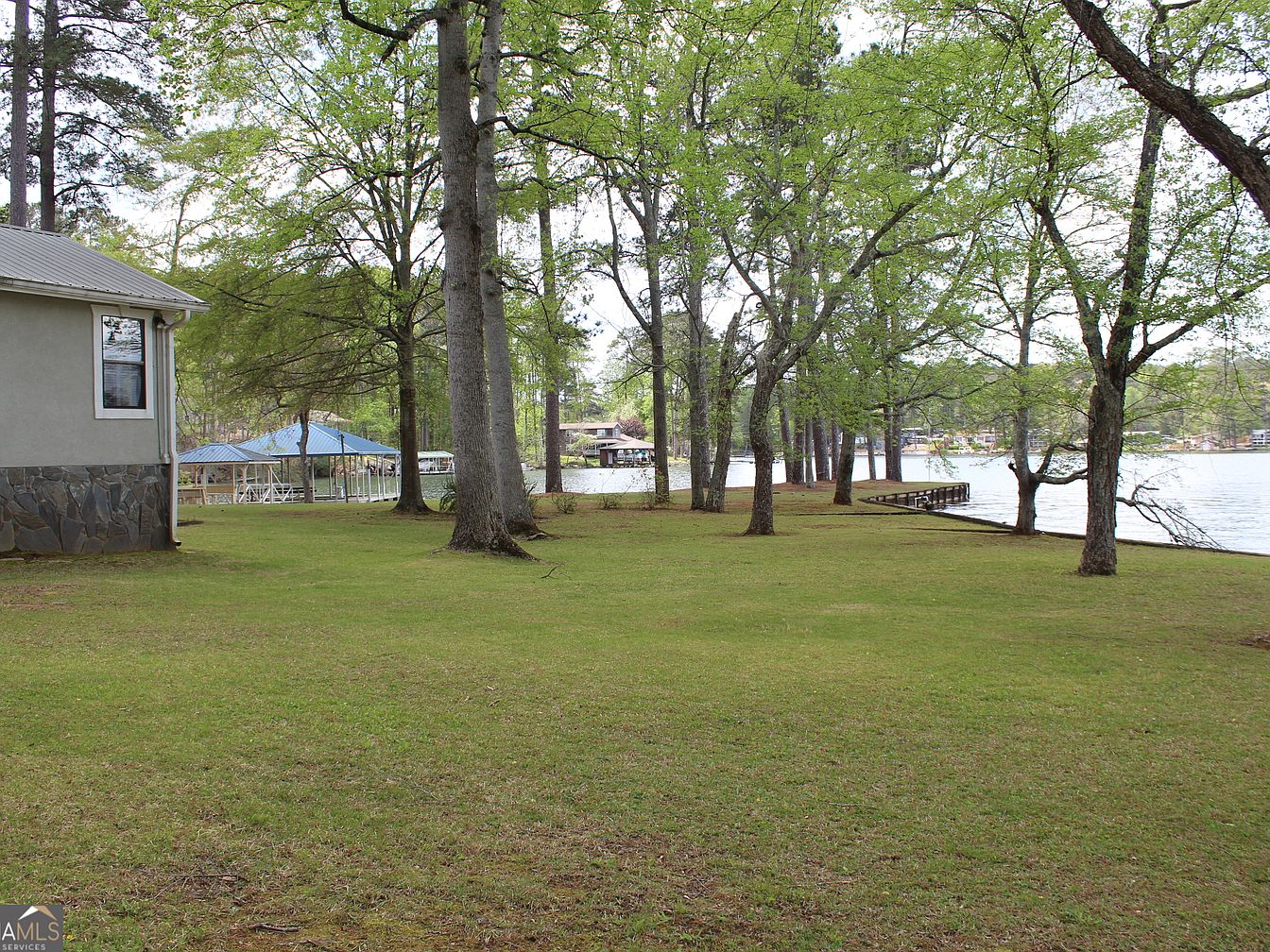 This serene lakeside space features a well-manicured lawn framed by tall trees, offering a peaceful ambiance. The greenery is vibrant, highlighting the lush grass beneath the shade of the trees. To the left, a charming home with a textured stone foundation blends with the natural setting. A glimpse of a covered boat dock is visible through the trees, suggesting recreational opportunities. The distant water sparkles under the daylight, creating a picturesque backdrop. This outdoor area is perfect for gatherings and relaxation, emphasizing the tranquility of nature while seamlessly integrating the home with its scenic environment.