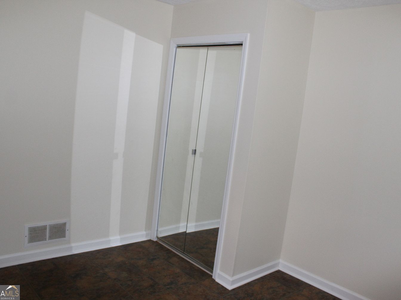 This corner of the bedroom features a sleek mirrored closet door, reflecting light and enhancing the sense of space. The walls are painted a soft beige, promoting a warm and inviting atmosphere. A light-colored baseboard frames the room, adding a touch of elegance. The flooring consists of dark tiles, offering a striking contrast against the walls and complementing various furniture styles. Natural light filters in, creating dynamic shadows that play across the surfaces. The uncluttered aesthetic conveys simplicity and functionality, making it a versatile area ready for personalization.