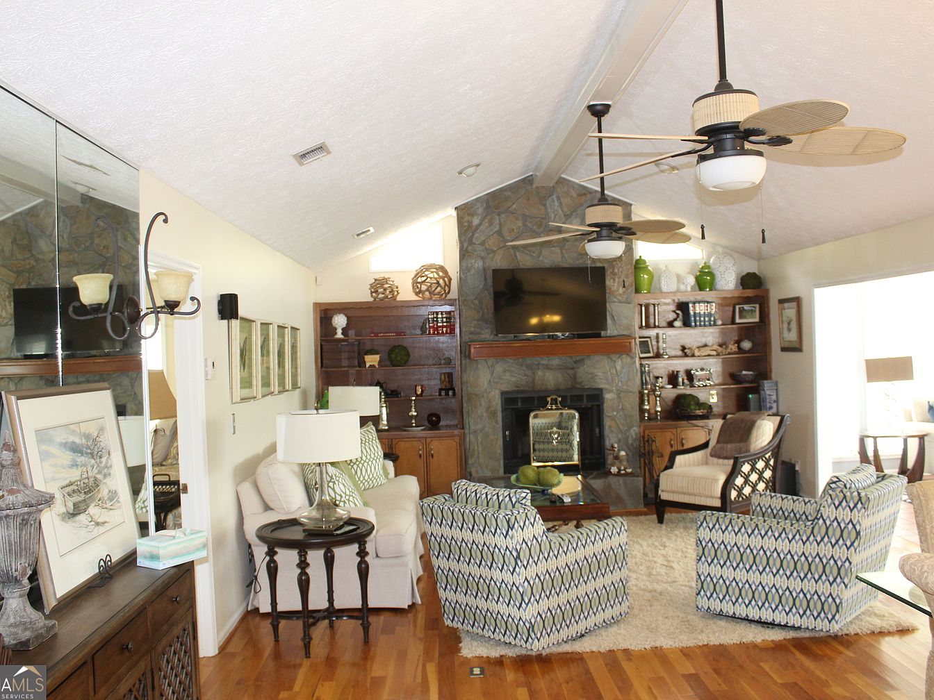The living room features a spacious, inviting layout with a high vaulted ceiling. Natural light filters in from large windows, enhancing the warm wooden flooring. A striking stone fireplace serves as a focal point, surrounded by tasteful decor. Two patterned chairs with a modern geometric design sit atop a plush area rug, fostering a cozy atmosphere. A light-colored sofa complements the space, accompanied by a circular accent table. Open shelving displays decorative items and books, contributing to the homey feel. Decorative lighting and a ceiling fan add charm, while earthy tones and green accents imbue the room with vibrancy.