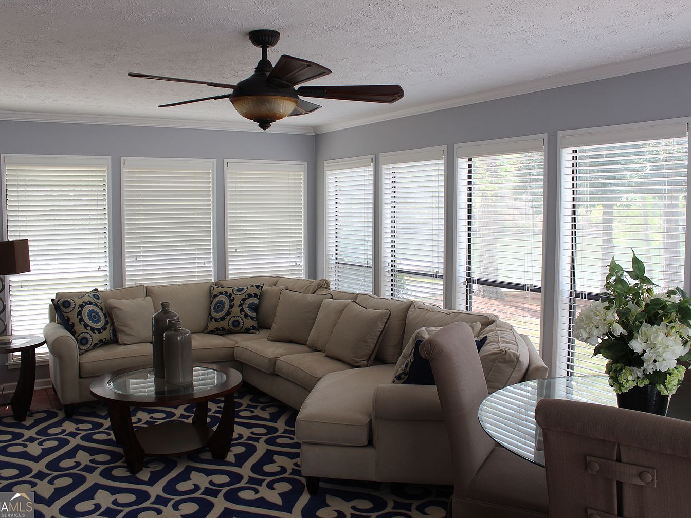 This sunroom showcases a spacious layout with large windows adorned with white blinds, allowing ample natural light. The walls are painted a soft blue, enhancing the room’s airy feel. A plush beige sectional sofa serves as the central seating area, accented with patterned throw pillows in deep blues. A round glass-top coffee table sits on a bold patterned area rug featuring swirling navy and white designs. Nearby, a small round table with elegant chairs provides a cozy nook, while potted plants add a touch of greenery, contributing to a serene and inviting atmosphere that blends comfort with style.