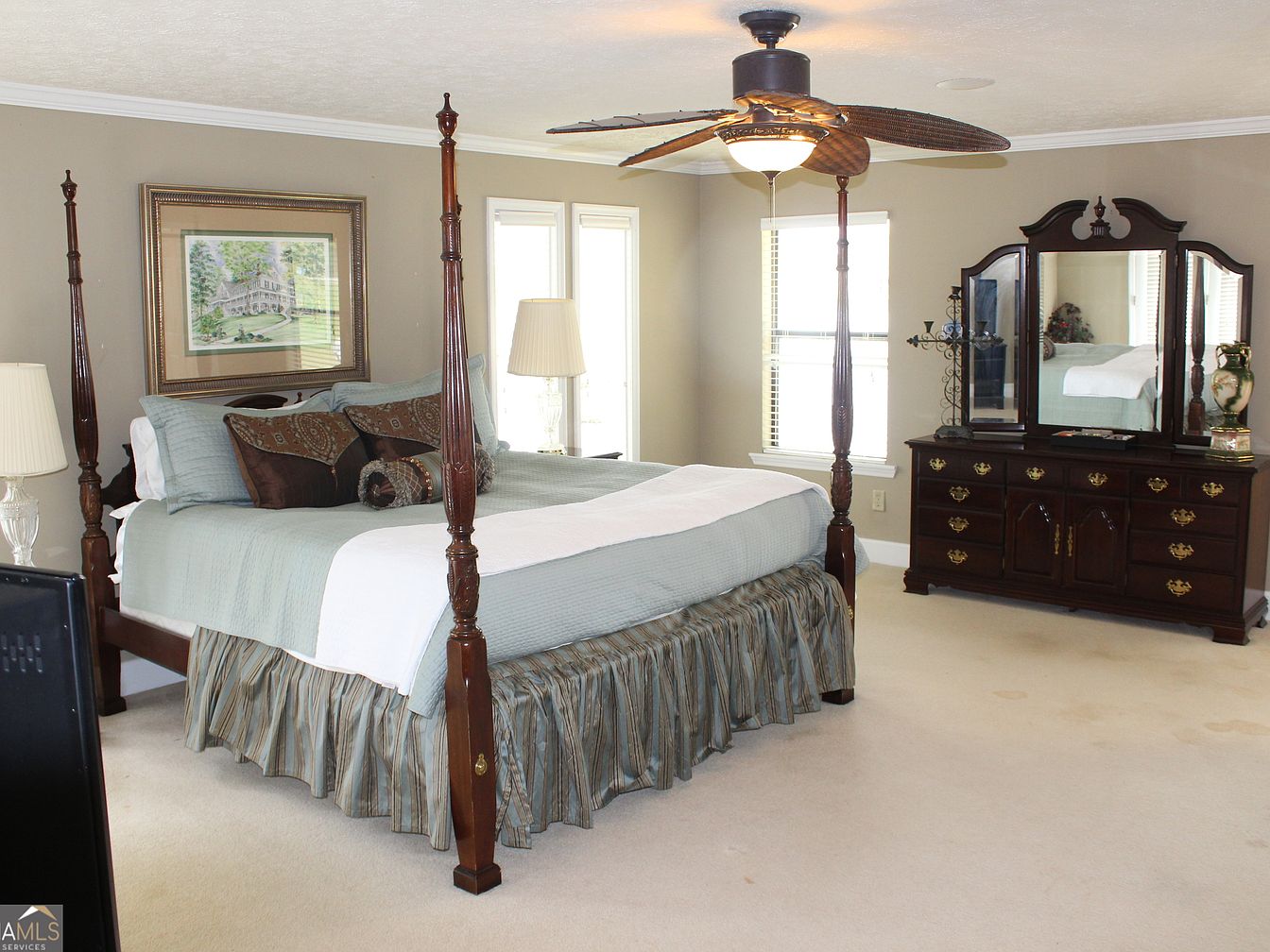 A spacious bedroom featuring a grand four-poster bed, adorned with soft blue linens and decorative pillows that enhance the serene ambiance. The wall behind is painted in a warm beige, complemented by natural light streaming through window treatments. A traditional dresser, rich in dark wood tones, displays ornate hardware and provides ample storage. A tasteful framed artwork of a landscape, positioned above the bed, adds character. The ceiling fan, with wooden blades, enhances airflow and aesthetic appeal. Light-colored carpet extends throughout, softening the space, while elegant lamps provide warm illumination, creating a cozy retreat.
