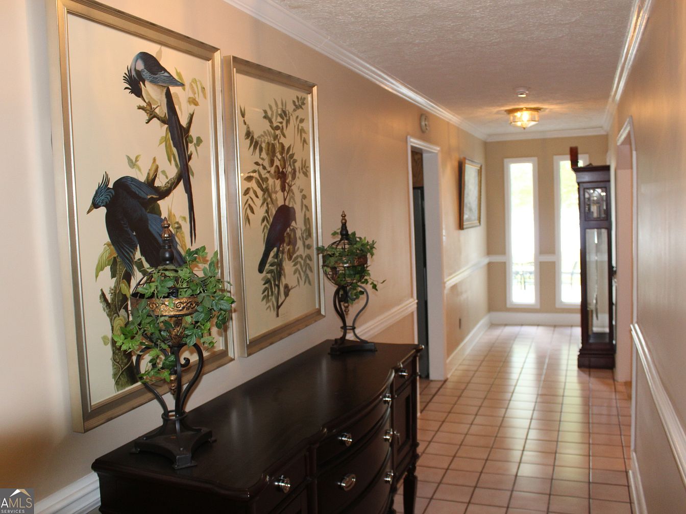 This elongated hallway features a warm beige color palette, complemented by elegant white crown molding. The walls are adorned with two large framed bird prints, introducing a touch of nature. Beneath these artworks, a dark wood console table with intricate detailing provides a stylish surface for decorative items. Potted arrangements with faux greenery add life and softness to the space. The floor is tiled, enhancing durability, and broad windows at the far end invite natural light, illuminating the area. A wall sconce near the ceiling casts a gentle glow, further enhancing the inviting atmosphere.