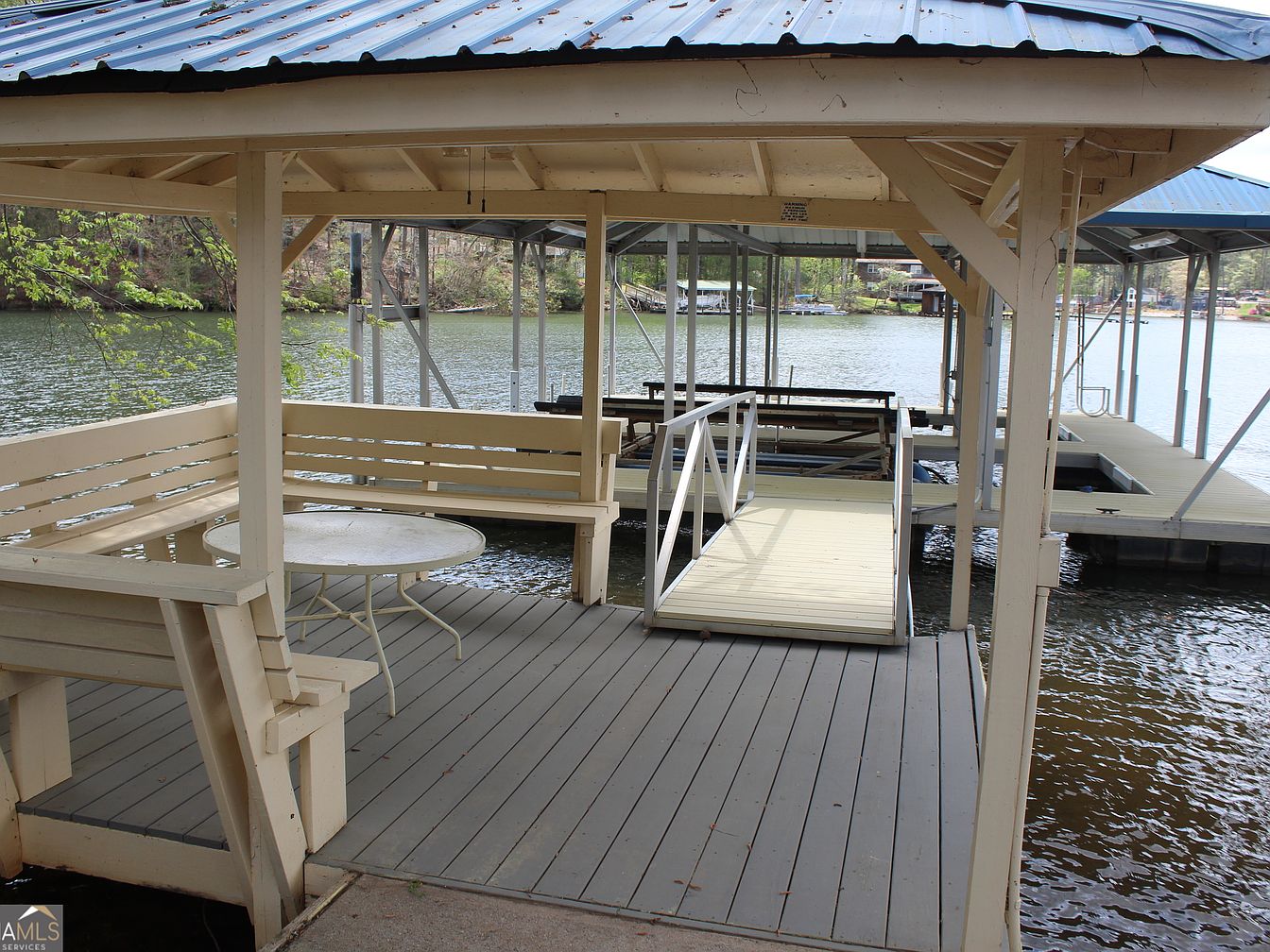 The dock features a spacious, open layout with a covered area supported by wooden beams. A light-colored wooden structure surrounds a round table on a silvery gray deck, enhancing a cozy atmosphere. The table’s metal legs complement the surrounding seating, which offers a perfect spot for relaxation. Adjacent to the dock, a wide pathway leads to additional docking areas, seamlessly connecting to the serene lakeside. The vibrant blue metal roof adds a touch of color against the greenery in the background, creating a tranquil setting perfect for enjoying the water views and fresh air.