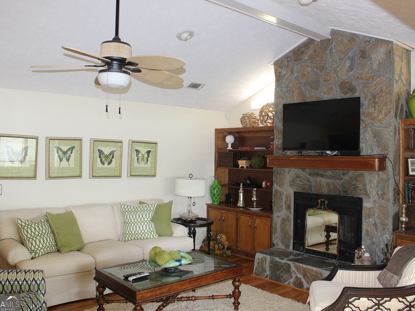 A cozy living room featuring a high, sloped ceiling adds spaciousness. Soft beige walls frame a comfortable cream sofa adorned with green-patterned pillows, creating a fresh, inviting atmosphere. Behind the sofa, four framed butterfly prints enhance the natural theme. The focal point is a rustic stone fireplace with a flat-screen TV mounted above, blending modern and traditional styles. A dark wood mantel and surrounding shelf display decorative items and books. A chic glass coffee table rests on a textured cream rug, while a wicker coffee table adds a touch of warmth. Natural light streams through a side window.