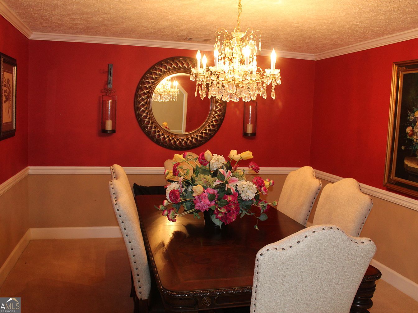 This dining room features a rich red color scheme that creates an inviting atmosphere. A dark wooden table is centrally positioned, surrounded by light-colored upholstered chairs with nailhead trim. A grand chandelier hangs from the ceiling, illuminating the space with a warm glow. A large round mirror with an ornate frame reflects light, enhancing the room’s elegance. On the walls, decorative sconces provide additional lighting, and a framed painting adds artistic flair. The combination of textures—from the polished wood to soft fabrics—and the contrast between the bold wall color and light accents create a balanced aesthetic.