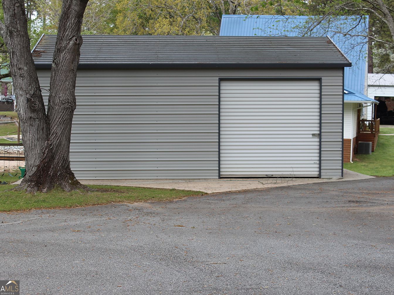 The image showcases a sleek garage with a simple, functional design. The exterior features a smooth, metallic siding in a light gray shade, contrasting with a dark trim along the edges. A prominent roll-up door dominates the facade, while the roof is pitched, clad in matching gray materials for a cohesive look. Two mature trees frame the garage, their textured bark adding a natural element to the structure. The surrounding area includes a well-maintained gravel driveway, enhancing practicality. In the background, hints of other structures and greenery suggest a suburban setting, integrating the garage within a peaceful environment.