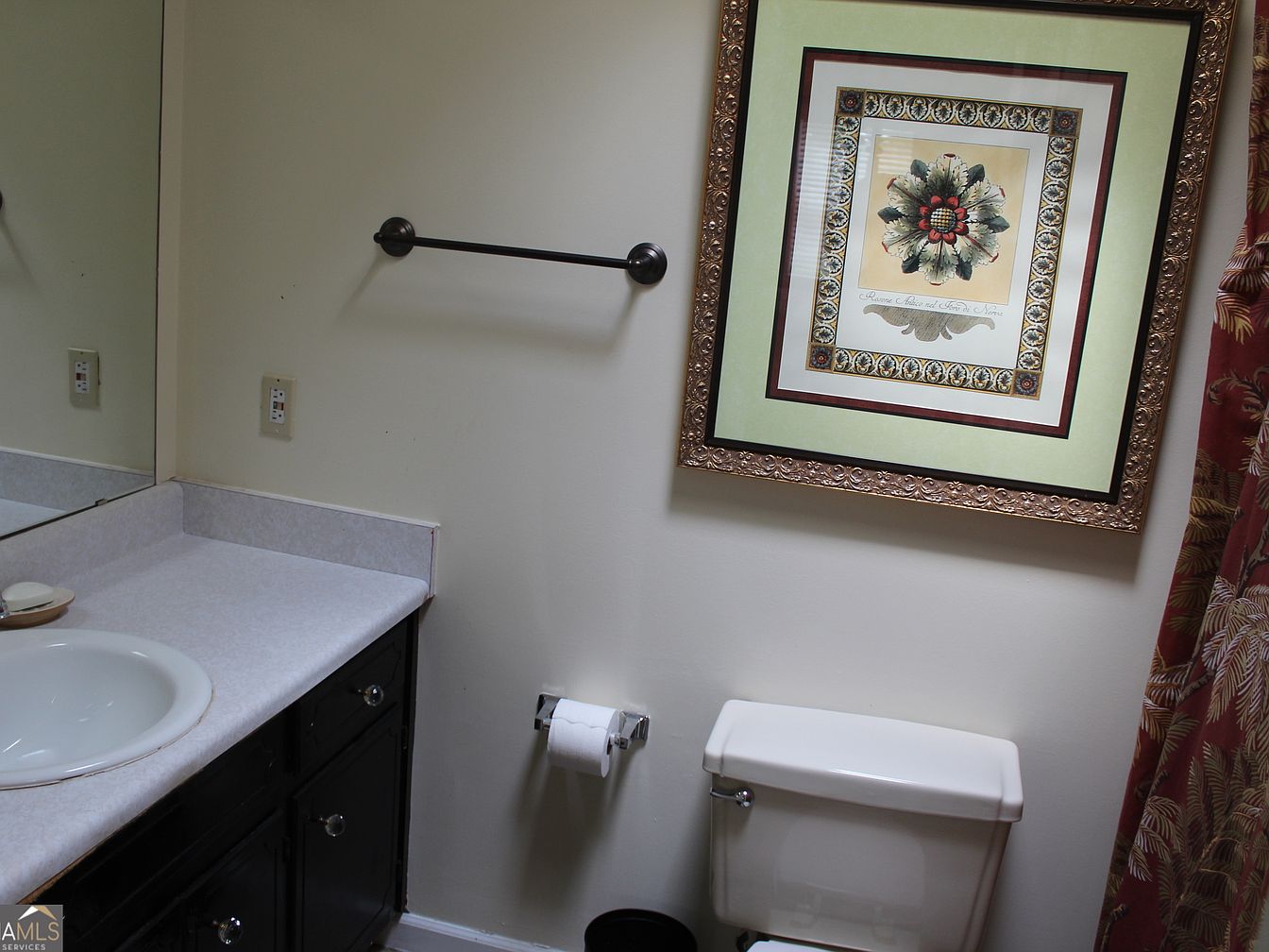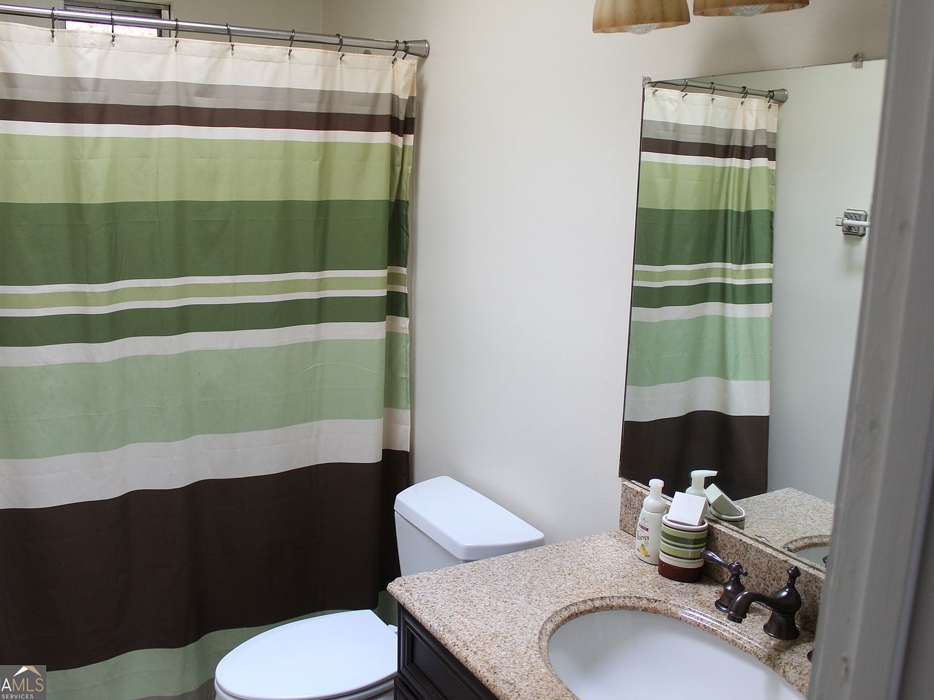 This bathroom features a neutral color palette highlighted by a striped shower curtain in various shades of green, beige, and brown. The layout includes a compact space with a white toilet and a stylish granite countertop, which complements the overall design. The mirror reflects the bright surroundings, enhancing the sense of space. Soft lighting from two glass pendant fixtures adds warmth, contrasting nicely with the minimalist aesthetic. The vanity is adorned with neatly arranged toiletries in soft colors, contributing to an organized appearance. This area balances functionality with an inviting atmosphere, making it both practical and visually appealing.
