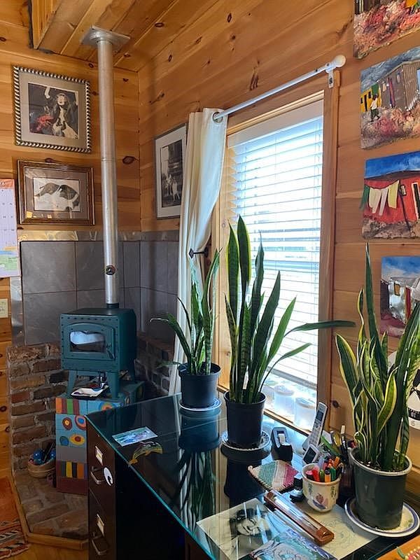 This cozy home office features a rustic wooden interior with warm tones, enhanced by a combination of natural wood paneling and exposed brick. A charming teal stove stands beside the gleaming glass-topped desk, providing a unique focal point. Two tall snake plants in ceramic pots flank the desk, adding a touch of greenery. Above the stove, a series of framed artworks and photographs adorn the walls, showcasing personal touches. Natural light filters through a window adorned with a sheer curtain, creating a serene and inviting ambiance. The overall aesthetic blends functionality with artistic expression, making it a perfect workspace.