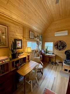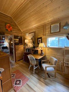 This cozy home office features natural wood walls and ceiling, creating a warm atmosphere. A small wooden desk sits against the wall, complemented by a light-colored, comfortable chair. Nearby, a second chair and a lamp provide a relaxed reading nook. The wooden floor enhances the rustic charm, while an area rug adds a pop of color with geometric patterns. Art adorns the walls, adding personality to the space. Large windows allow ample natural light, making it inviting. The overall design reflects a blend of functionality and comfort, ideal for productivity and relaxation.