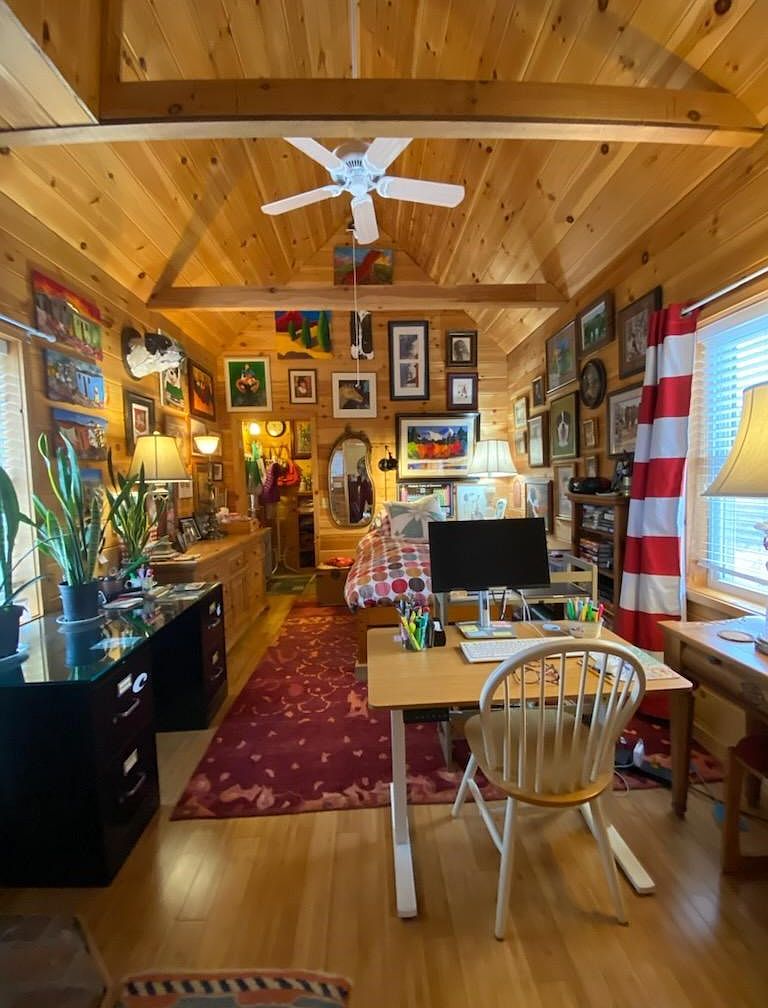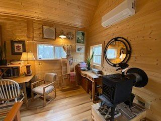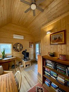 A cozy home office exuding warmth, featuring wood-paneled walls and a soaring ceiling. Natural light streams in through multiple windows, illuminating the space. A small wooden desk is paired with a comfortable chair, while a vintage-style mirror adds a touch of sophistication. A charming wood stove rests on a tiled base, contributing to the rustic feel. Light-colored hardwood floors enhance the room’s brightness, complemented by strategic lighting from a table lamp. Decorative art pieces and plants enliven the room, creating an inviting atmosphere ideal for productivity and relaxation.