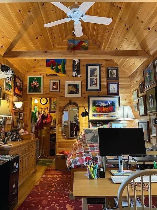 This vibrant bedroom features a warm wooden aesthetic with tongue-and-groove paneling and high, sloped ceilings. An eclectic array of artwork adorns the walls, showcasing colorful paintings in various frames, giving a personal touch to the space. Natural light spills in from a window adjacent to a cozy bed adorned with a patterned quilt in bright, bold colors. A retro vanity mirror reflects light, enhancing the room’s brightness. A modern desk with a computer and stationery sits in the foreground, juxtaposing the rustic charm. Decorative lamps provide soft lighting, creating an inviting and creative atmosphere.