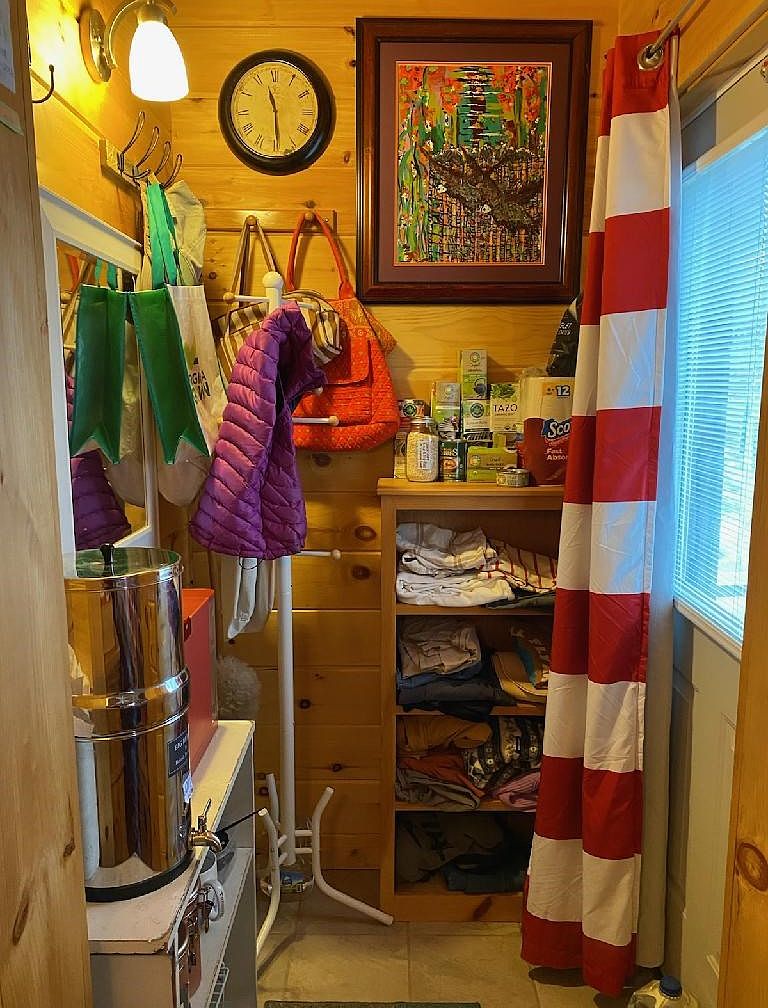 The mudroom features warm wooden walls that impart a cozy, rustic feel. A round clock hangs above hooks laden with bags and outerwear, including a vibrant purple jacket. Beneath the clock, a colorful framed artwork injects personality into the space, contrasting with the neutral tones of the wood. A shelf nearby holds neatly folded clothing, while a silver storage container sits adjacent to a clothing rack. The striped curtain adds a playful touch near the window, allowing natural light to pour in, enhancing the inviting atmosphere. The tiled floor contributes to the utility of this functional yet stylish area.