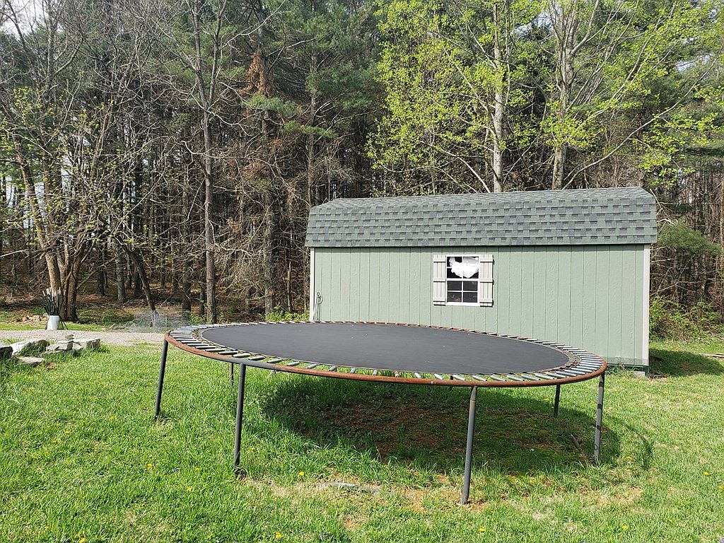 A vibrant backyard scene features a large black trampoline prominently positioned on lush green grass. Behind it stands a quaint shed, painted in soft green, with a darker green shingled roof. The shed showcases a small window covered by shutters that adds a rustic charm. Surrounding the area, sparse trees and emerging spring foliage create a natural backdrop, enhancing the serene atmosphere. A few stones laid on the ground hint at landscaping details, while patches of dandelions add playful touches of yellow. Overall, this outdoor space combines recreational and natural elements beautifully.