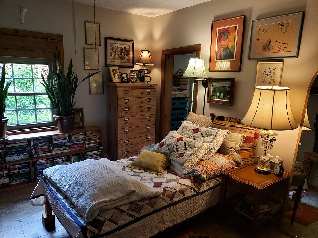 A cozy bedroom featuring a patchwork quilt spread across an unmade bed, overflowing with an assortment of colorful pillows. A warm wood frame supports the mattress, complemented by a rustic nightstand displaying a vintage lamp. The room is illuminated softly by multiple light sources, including two lamps positioned strategically beside the bed, casting a welcoming glow. On one side, a tall wooden dresser stands adorned with framed photographs and art, while the opposite wall showcases a collection of framed prints. A lush green potted plant sits by the window, enhancing the natural ambiance, with a bookshelf filled with various titles below.